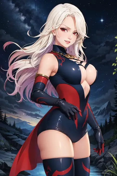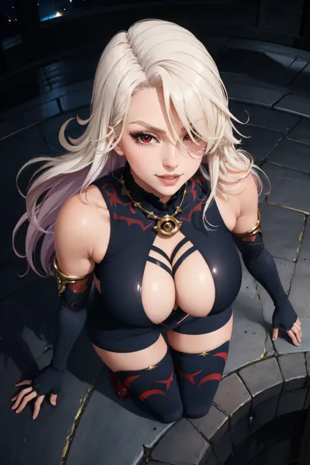 Add "hair over one eye, black leotard, cleavage cutout, elbow gloves, black thighhighs" for her typical look.
