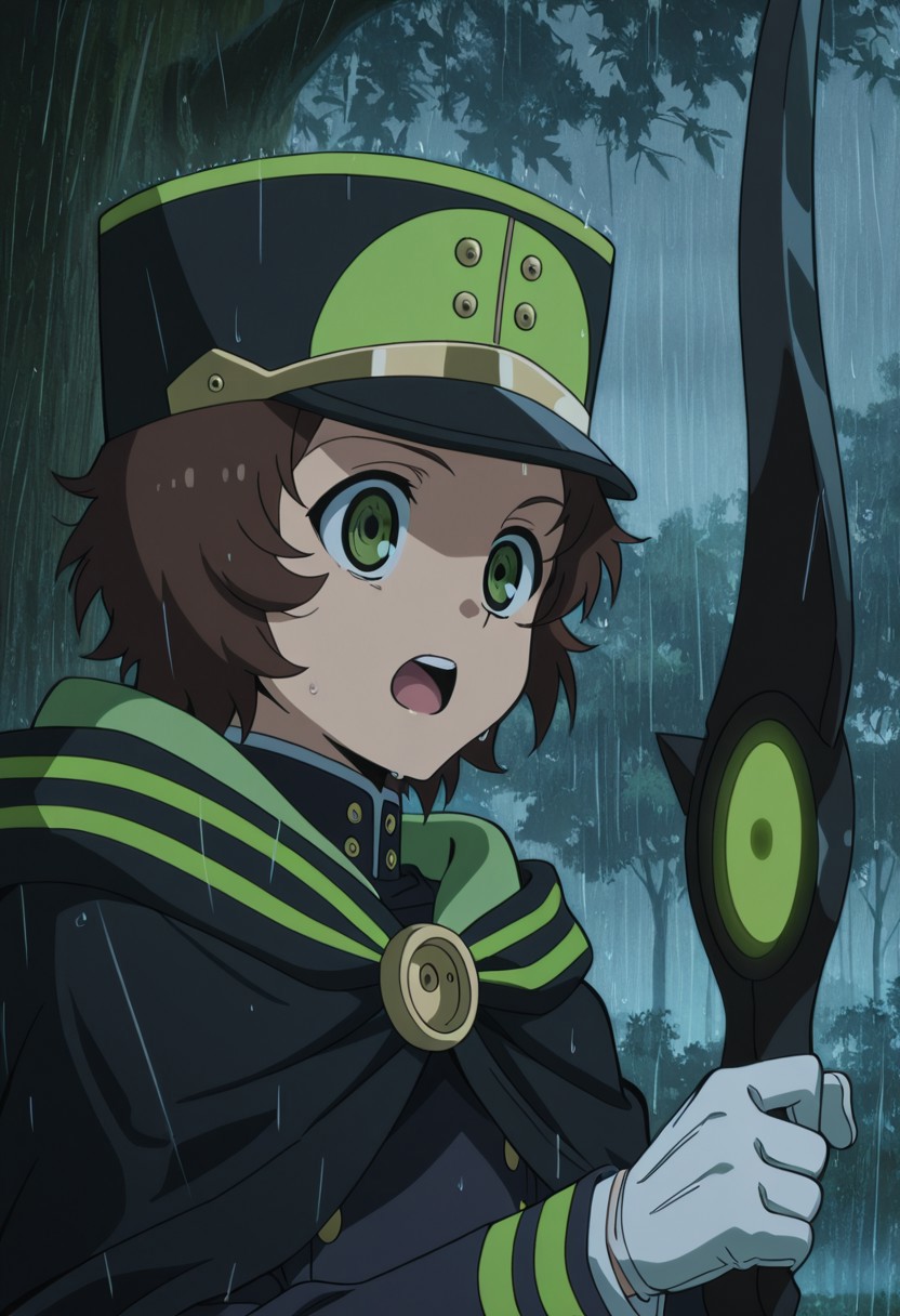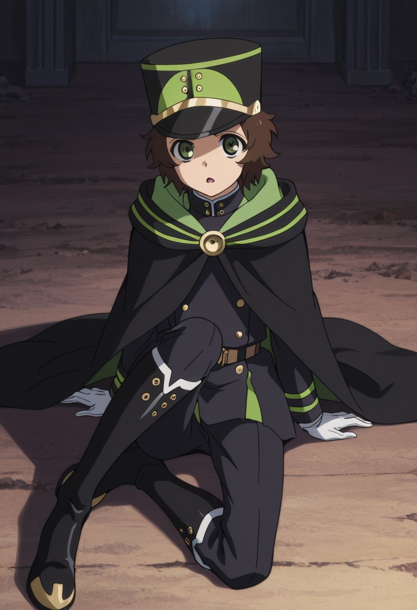 1boy, male focus, solo, green eyes, brown hair, hair between eyes, uniform, hat, shako cap, black headwear, black cape, hood, black jacket, belt, white gloves, black pants, knee boots, black footwear,