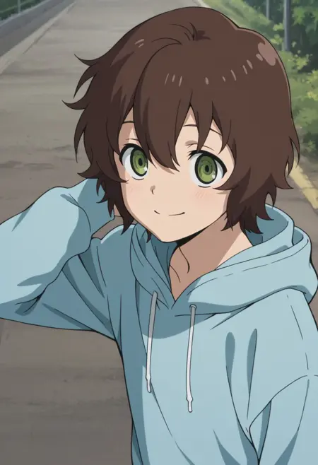1boy, male focus, solo, green eyes, brown hair, hair between eyes, school uniform, grey jacket, grey pants, sneakers, white footwear,