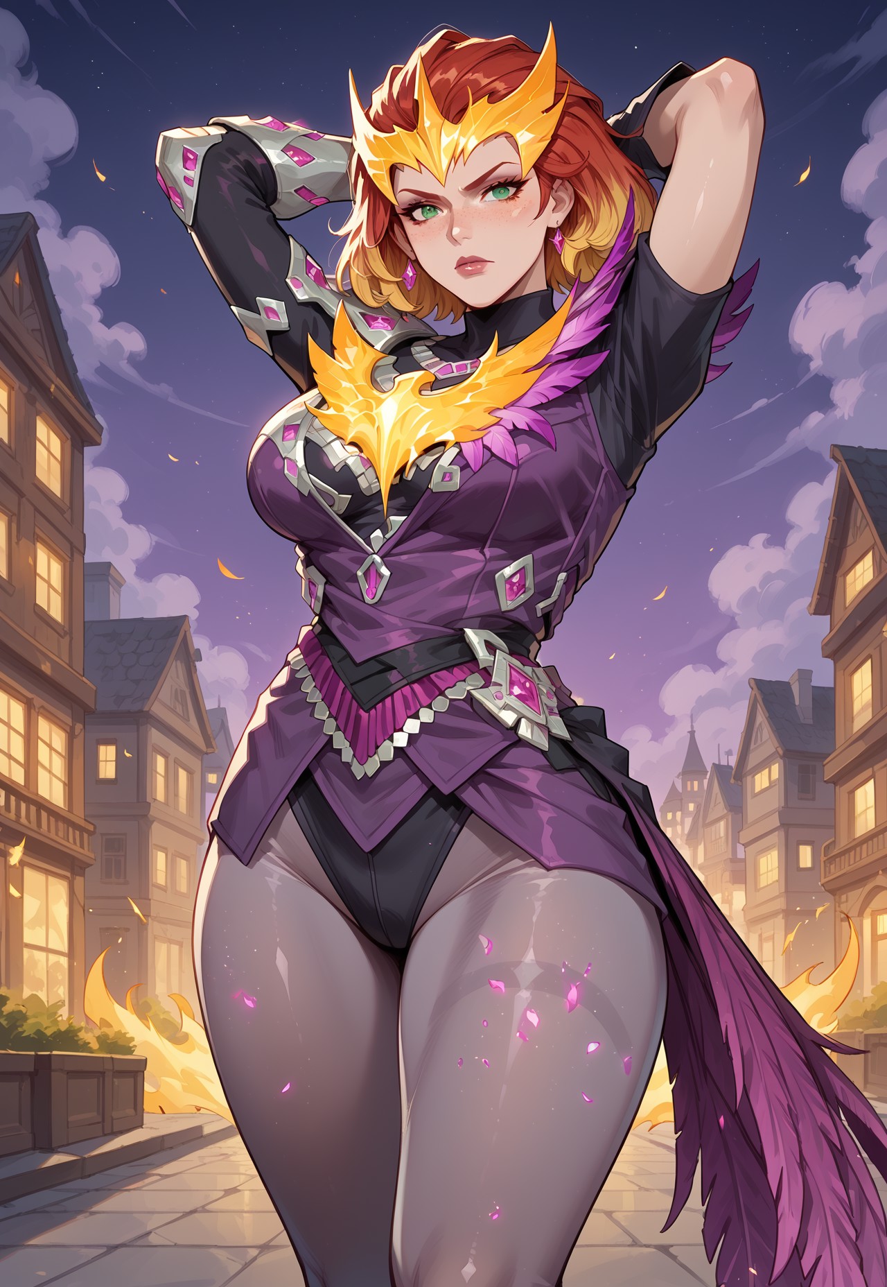Chaos_Phoenix, two tone hair, red hair, yellow hair, medium hair, green eyes, freckles, curvy, black leotard, purple jacket, one side down jacket, purple feathers, long feathers, phoenix emblem, emblem on chest, glowing emblem, golden crown, single arm armor, grey armor, purple crystals armor, black gloves, fingerless glove, purple pantyhose, glitter pantyhose, black boots,