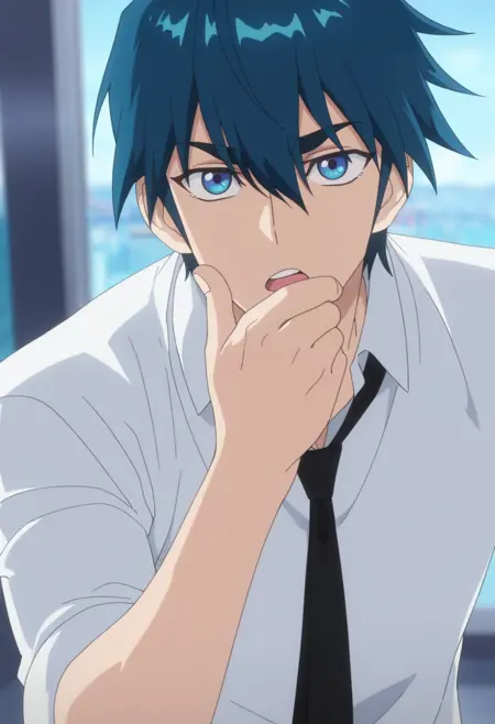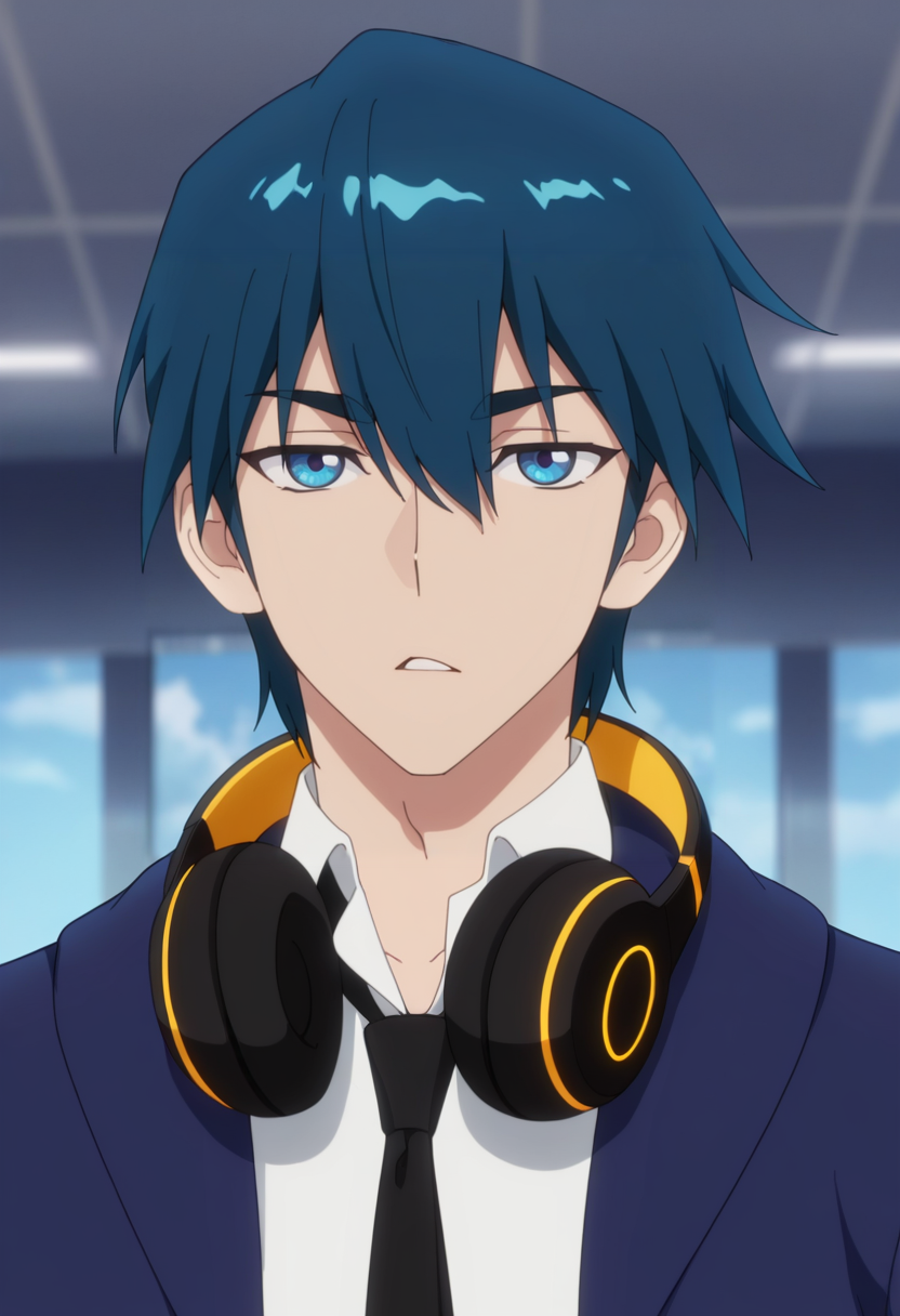 ah jie, blue eyes, blue hair, short hair, bangs