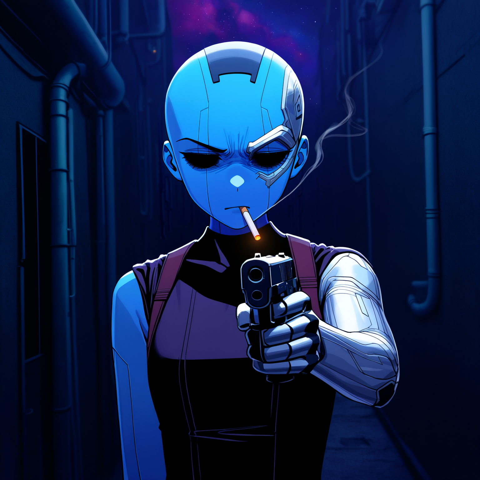 기본 프롬프트: 1girl, nebula, blue skin, cyborg, black eyes, black sclera, bald, mechanical arms