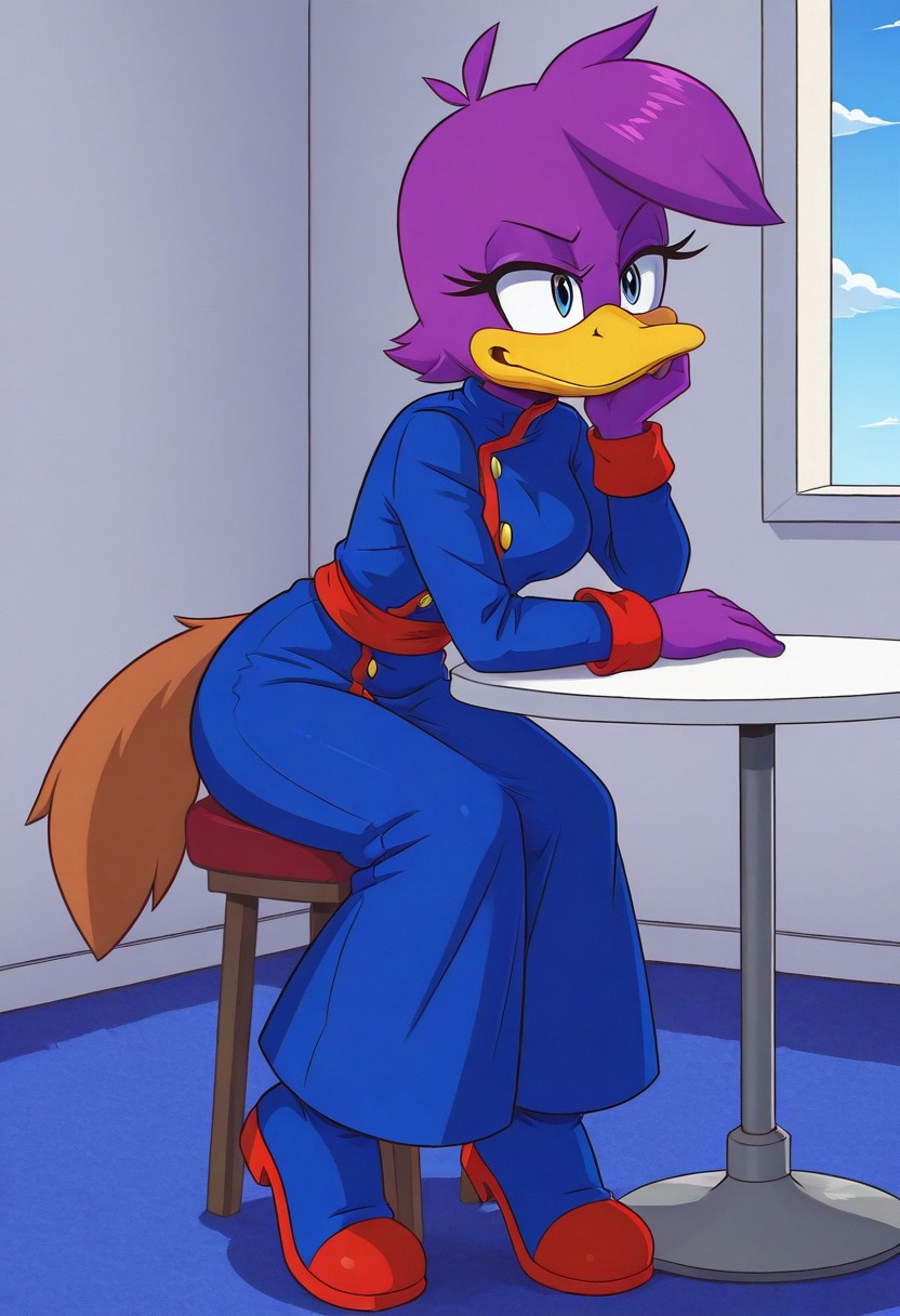 Penelope the Platypus, purple fur, yellow beak, blue eyes, brown tail, blue uniform, red sash, blue shoes