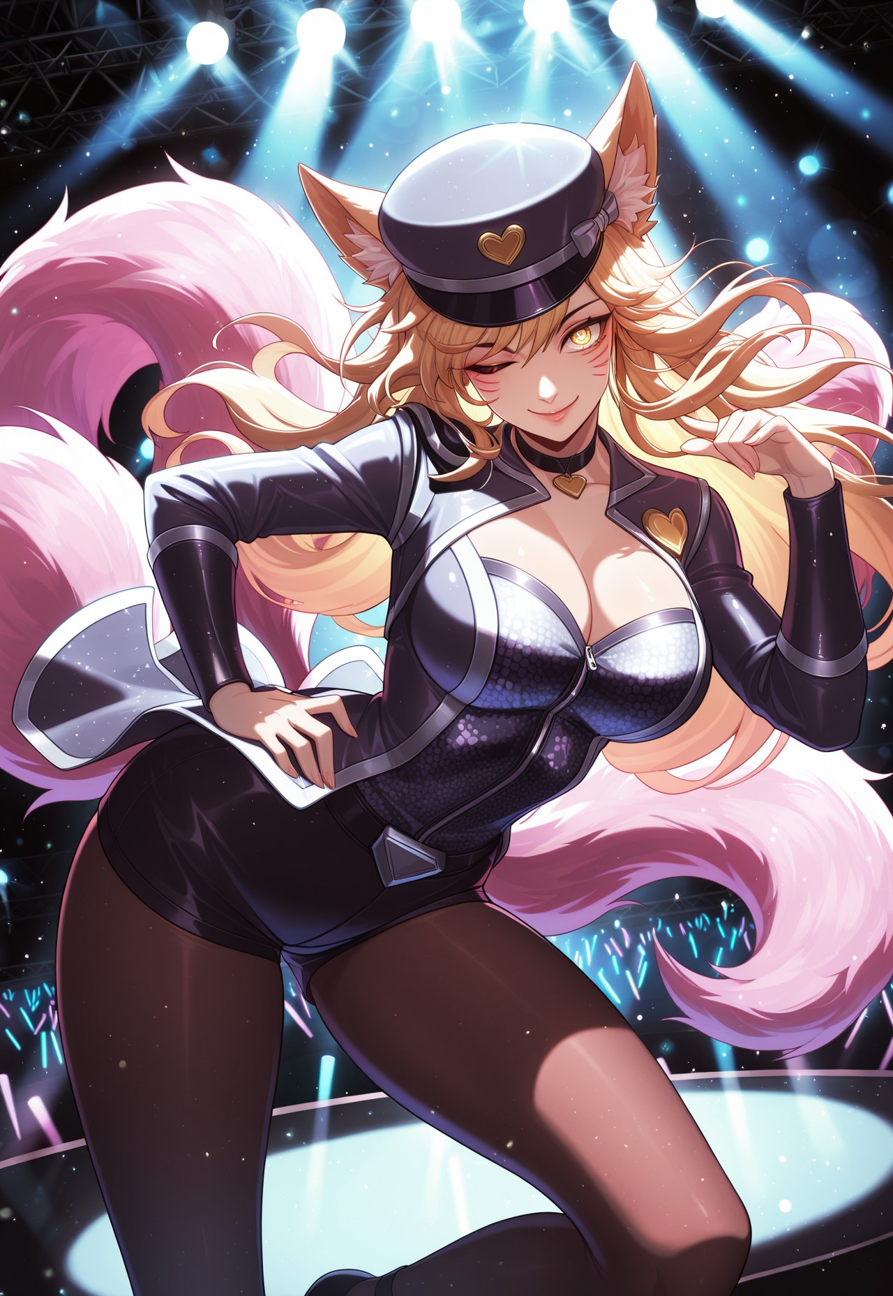 PPSahri,blonde hair,long hair,yellow eyes,whisker markings,fox girl,fox tails,pink tails,multiple tails,cleavage,multicolored dress,headwear,big breasts,pantyhose
