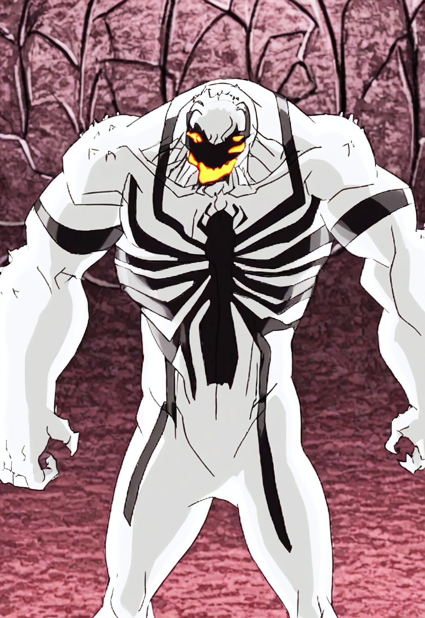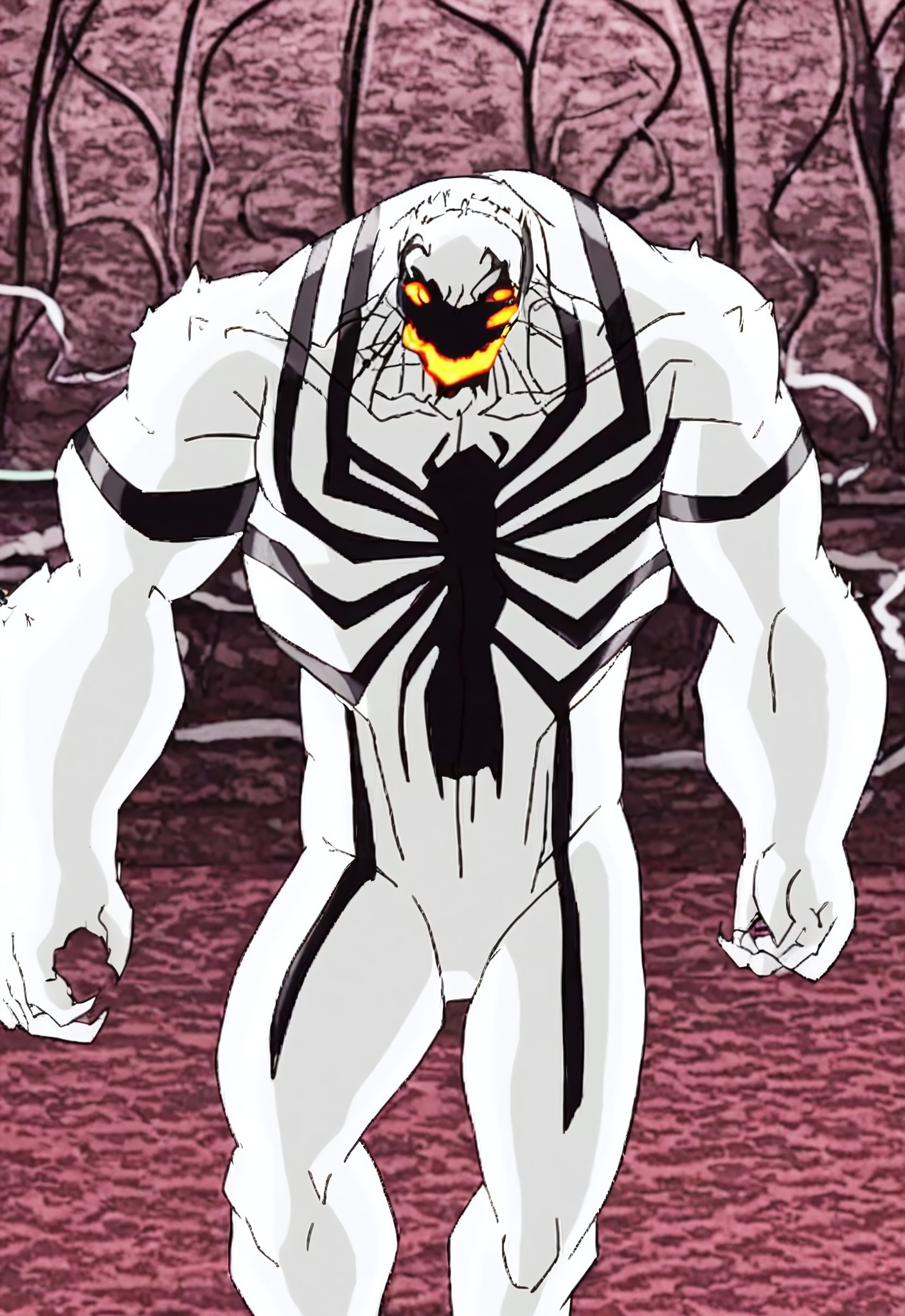 anti-venomultimate_(cartoonseries)XL, symbiote, white suit, body suit, black print, spider print, orange eyes, glow eyes, mouth, glow mouth, 1boy, solo, monsterboy, sharp teeth, muscular, claws,