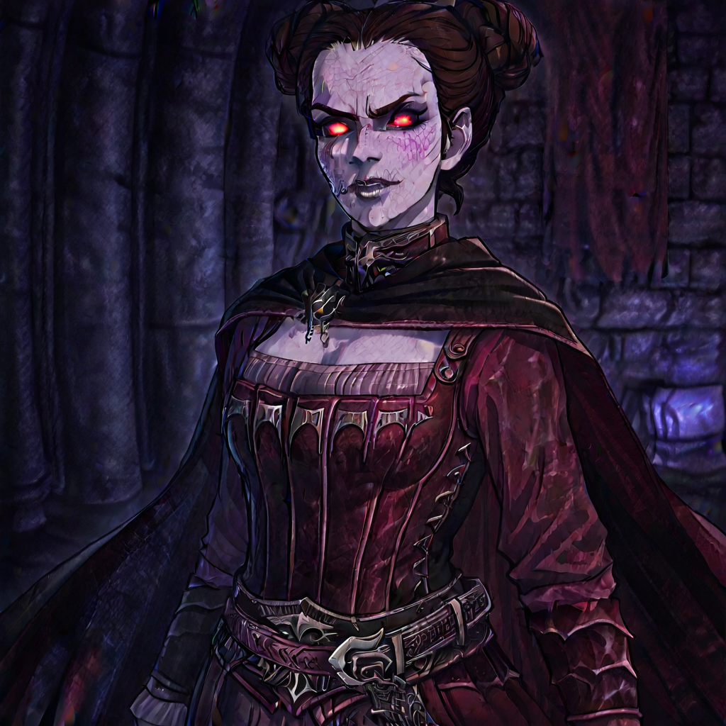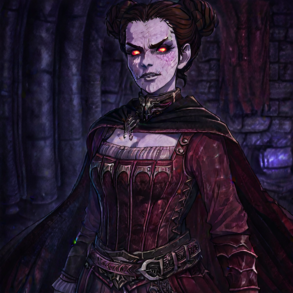 기본 외모: valerica_skyrim, 여성 뱀파이어, 고대 뱀파이어 여성, 창백한 회색 피부, 빛나는 황금색 눈, 날카로운 시선, 성숙한 얼굴 특징, 미세한 주름, 어두운 갈색 머리카락을 쌍둥이 단발로 묶음,