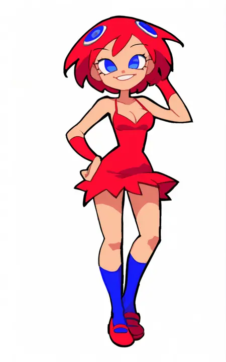 For her Outfit 1: dress,red hair, red dress,short dress,shoes, red shoes,cleavage,sleeveless,socks,blue socks**
