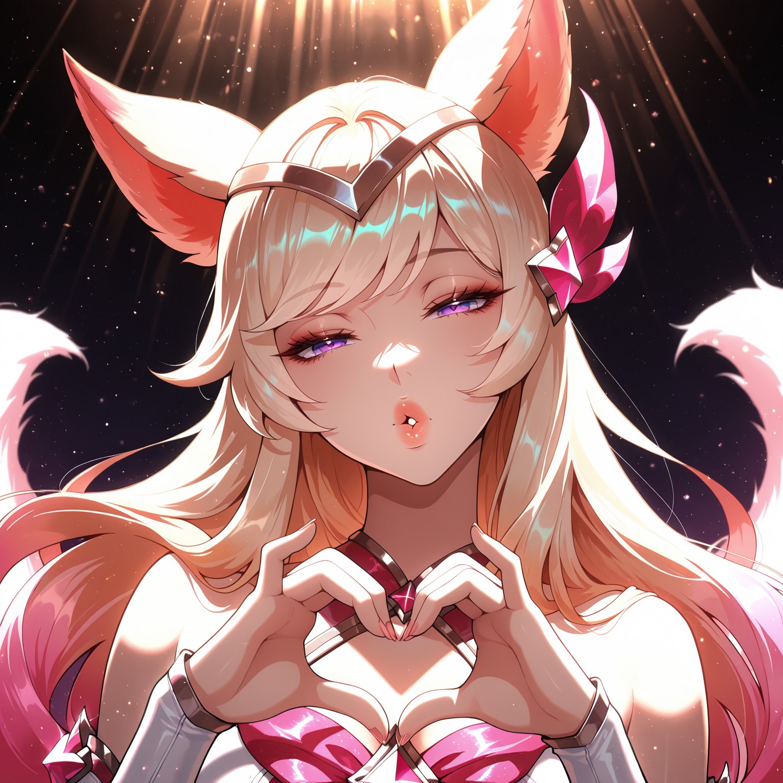 SGahri,blonde hair,gradient hair,fox girl,fox tails,multiple tails,fox ears,long hair,hair ornament,purple eyes,multicolored dress,detached sleeves,skirt,thighhighs,
