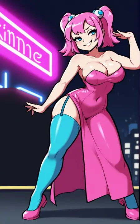 彼女の衣装1:ドレス、太ももハイソックス、ピンクの髪、ピンクのドレス、胸元の開き、サイドスリット、ガーターストラップ、靴、青い太ももハイソックス、ストラップレス、ストラップレスドレス、ピンクの履物、服の文字、裸の肩