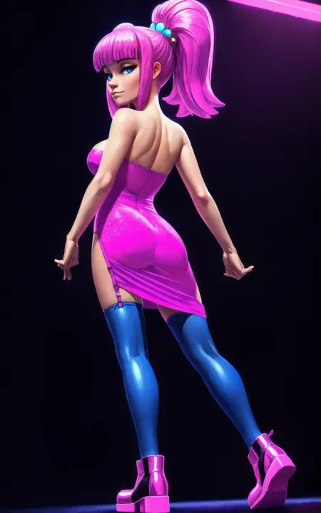 她的服装1:连衣裙,过膝袜,粉发,粉色连衣裙,露乳,侧开叉,吊袜带,鞋子,蓝色过膝袜,无肩带,无肩带连衣裙,粉色鞋履,衣物文字,裸露肩膀