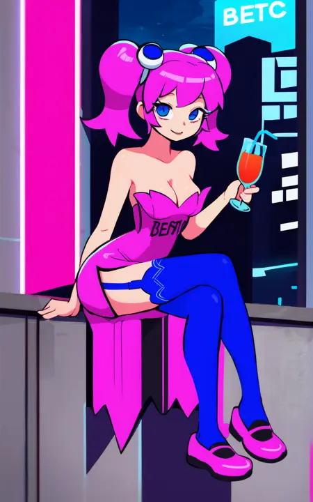 아웃핏 1: 드레스, 허벅지 양말, 분홍색 머리, 분홍색 드레스, 가슴 노출, 측면 슬릿, 게터 스트랩, 신발, 파란 허벅지 양말, 스트랩리스, 스트랩리스 드레스, 분홍색 신발, 옷에 쓰인 글자, 어깨 노출