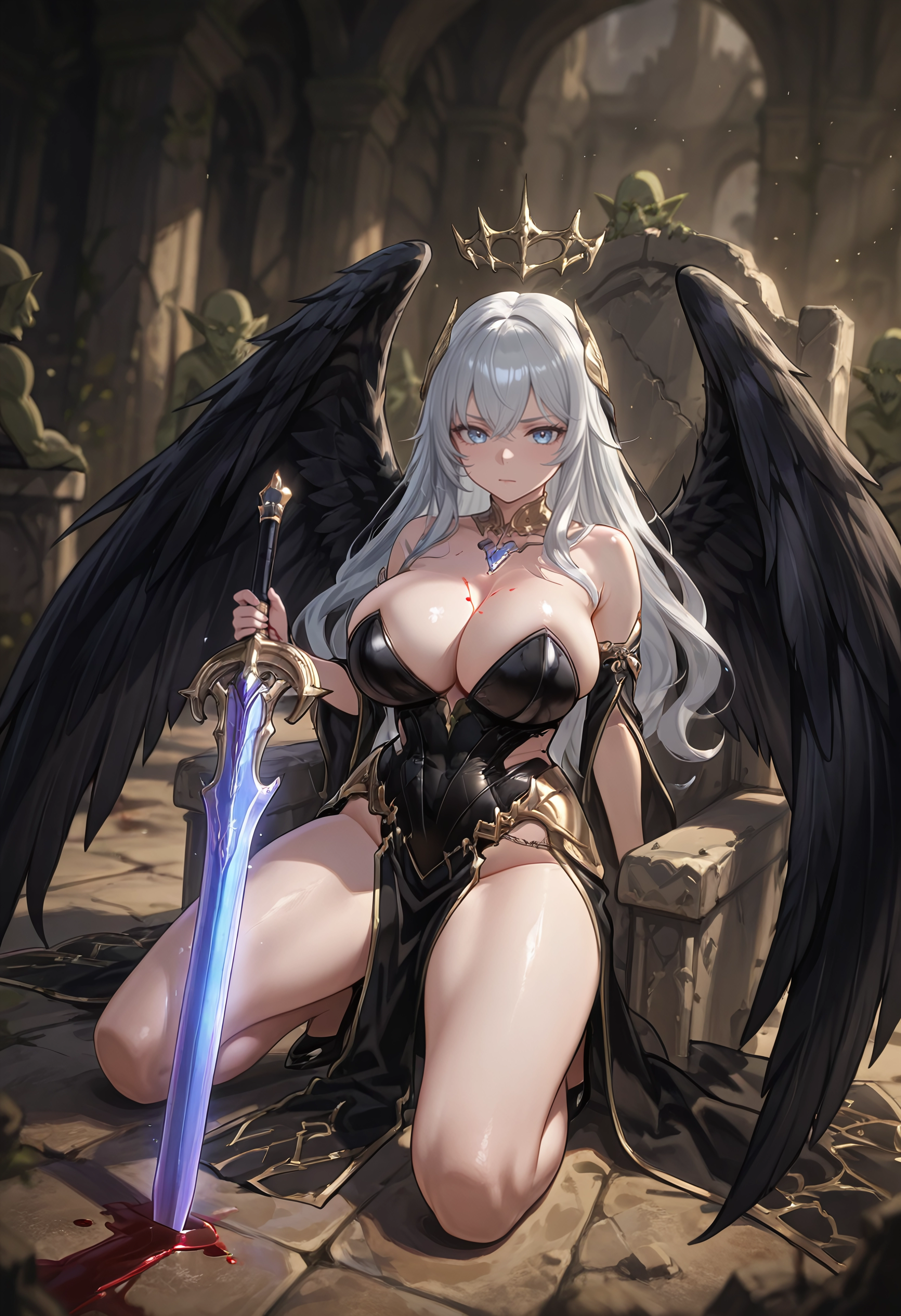 large breasts, grey hair, long hair, blue eyes, halo, skindentation, thick eyelashes