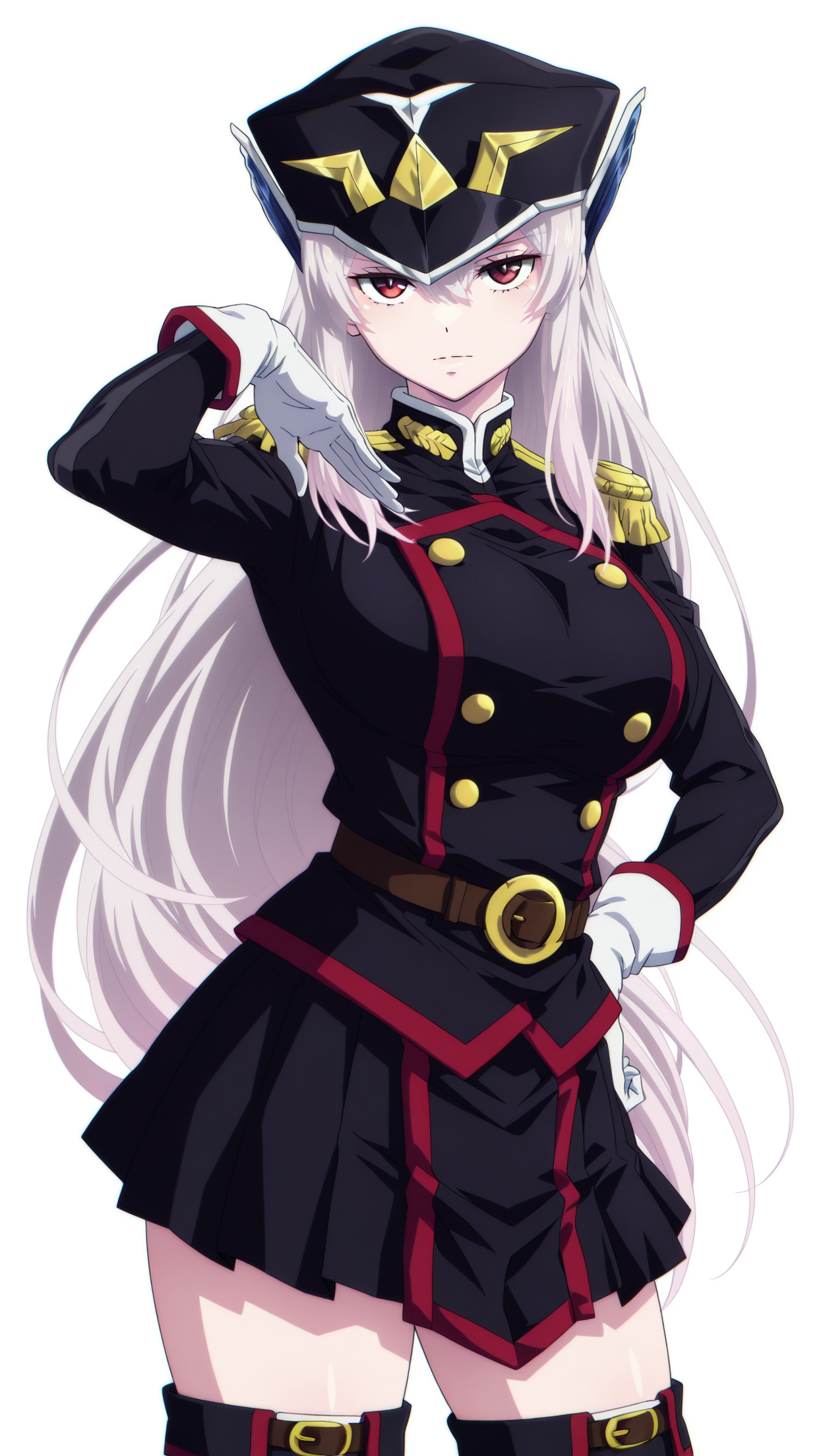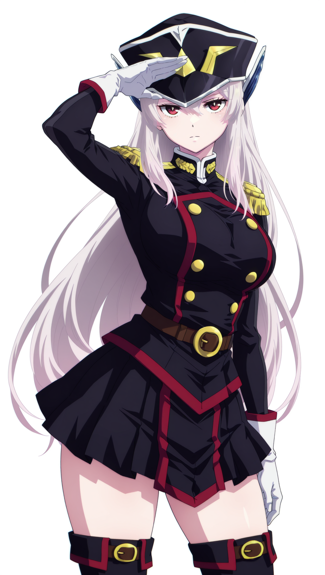 anime coloring, masterpiece, best quality, amazing quality, uz3nky0uk4, 1girl, long hair, silver hair, red eyes, large breasts, peaked cap, hair ornament, military uniform, black uniform, epaulettes, gloves, white gloves, belt, skirt, black skirt, pleated skirt, thigh boots, black footwear, solo, pose, standing, looking at viewer, from front, ((((white background, simple background))))