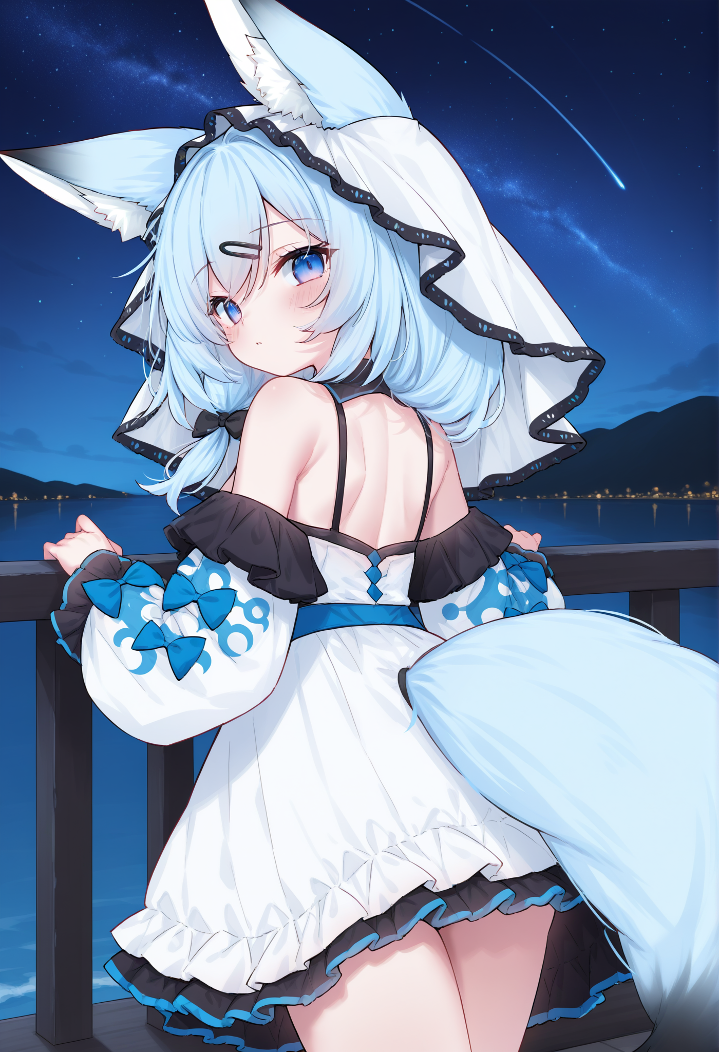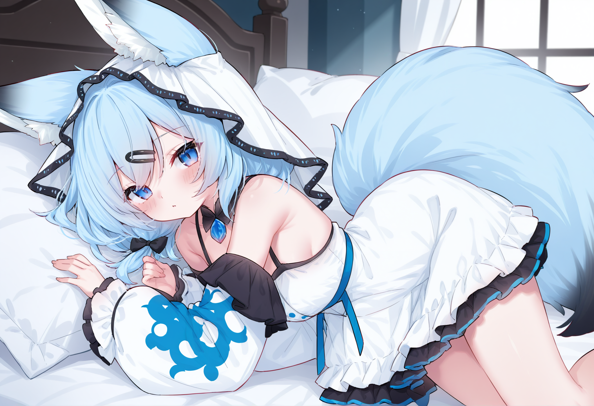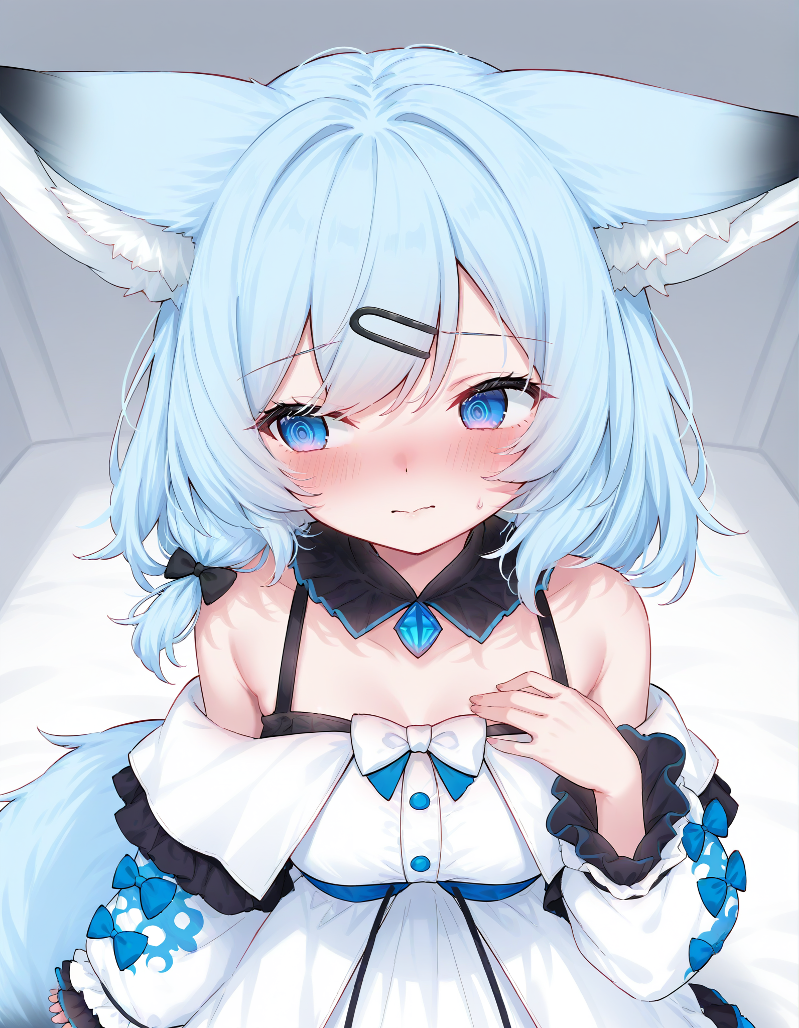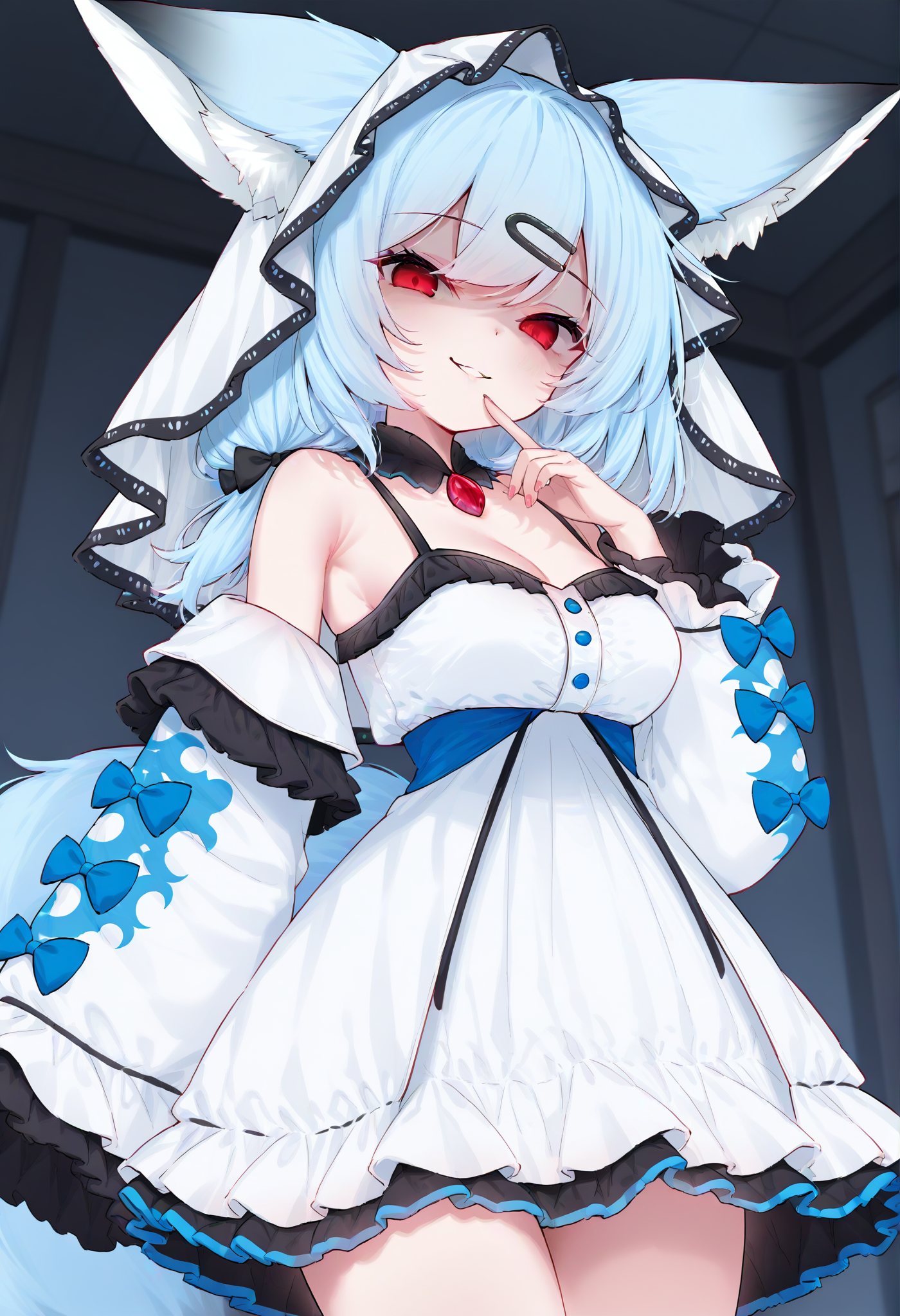• 基礎外観(Base Appearance): animal ears, tail, blue hair, blue eyes, medium hair, gradient eyes, dress, white dress, fox girl, bow, blue bow sleeves, black bow, hair bow, blue gemstone, hairclip, white veil, frilled dress, long sleeves, detached sleeves, off-shoulder capelet, white bow