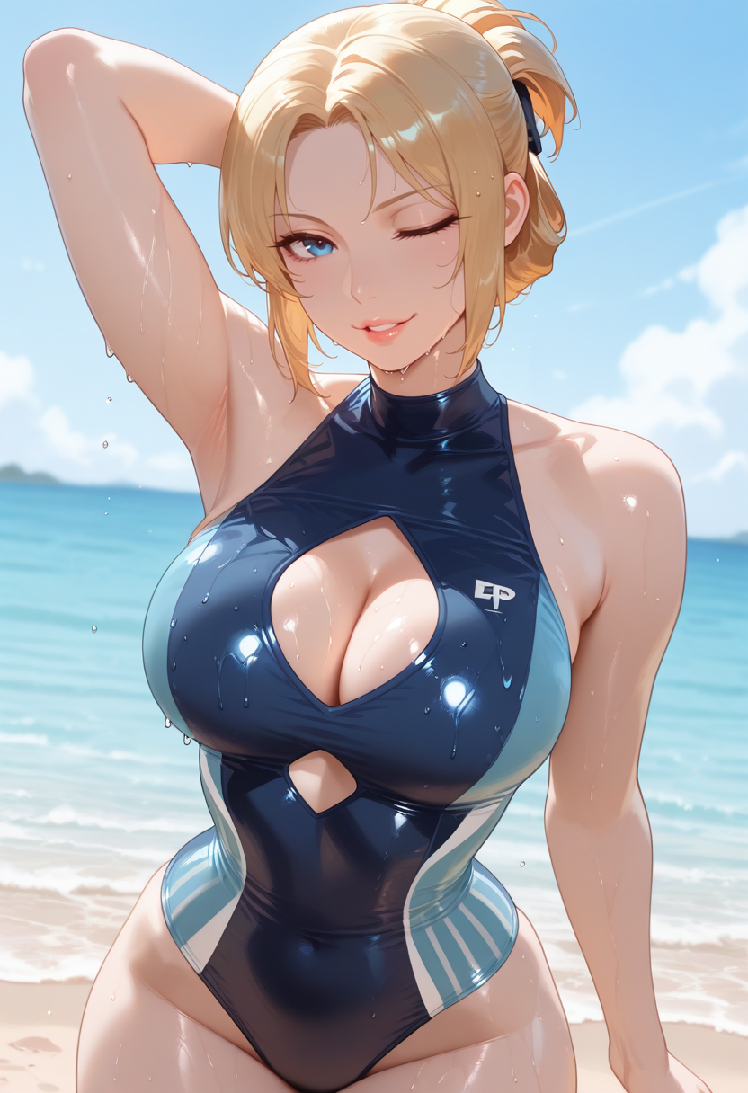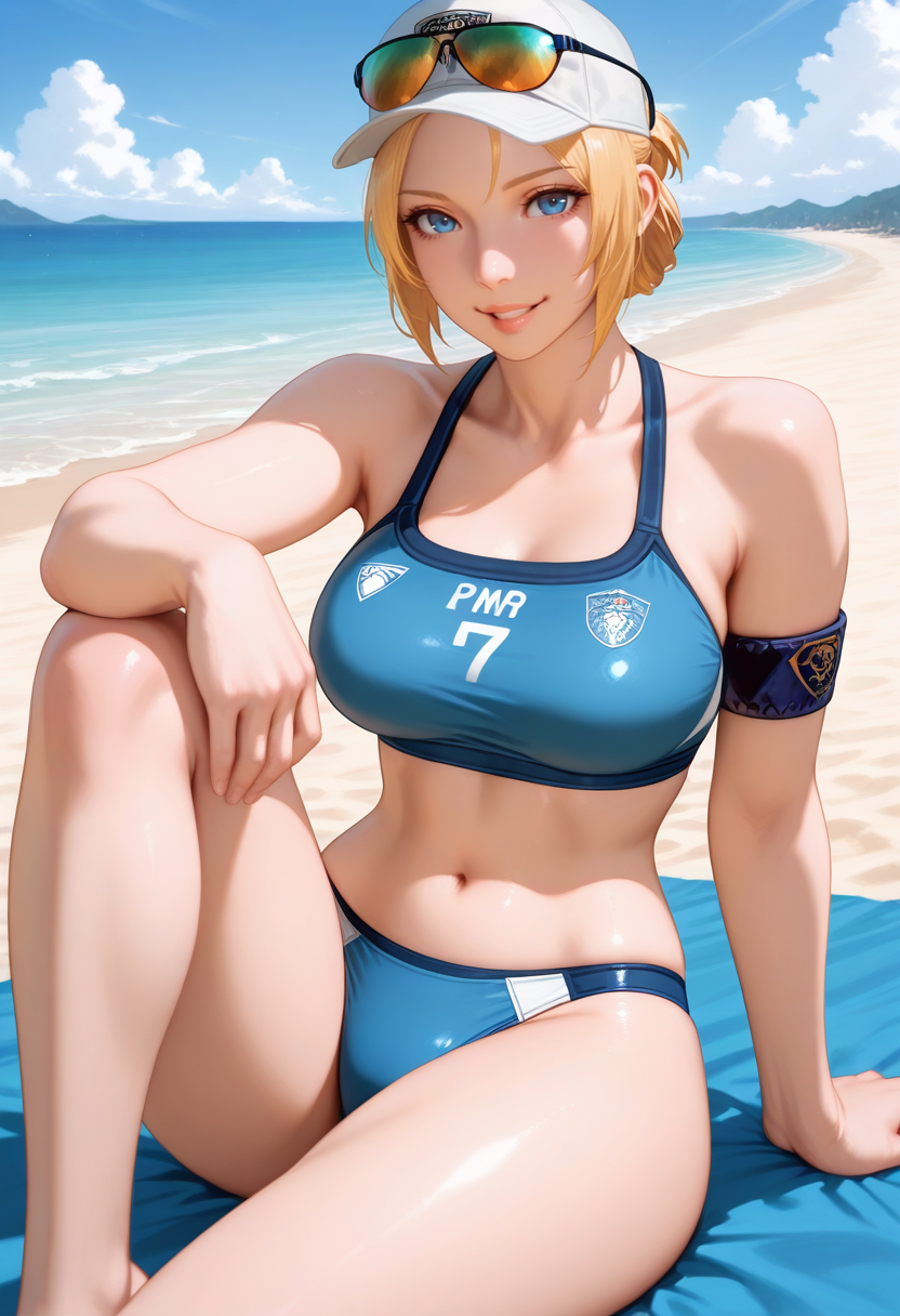 "SP0LUC、金髪、サイドロックス、折りたたみポニーテール、青い目、唇、ビーサーキャップ、色付き眼鏡、頭部に眼鏡、青いスポーツブラ、アームレット、青いビキニボトム"