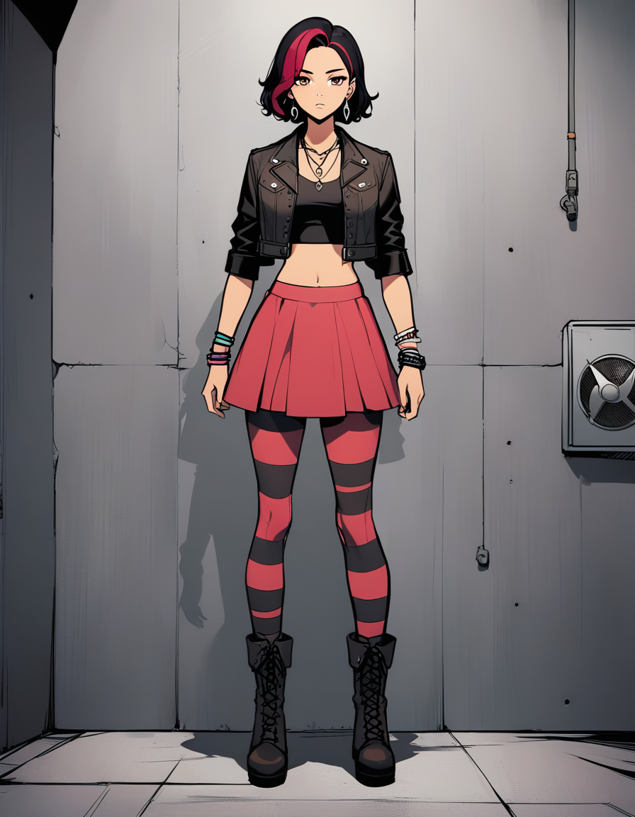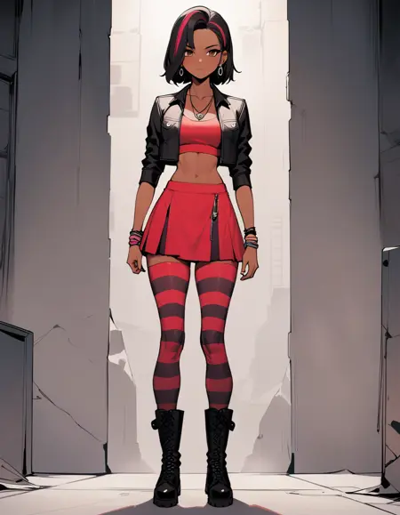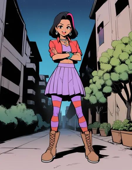 GTAバイスシティのメルセデス・コルテズ。トリガー文は「MercedesCortez」、ゲーム内衣装は「クロップドトップ、短めのジャケット、スカート、縞模様のストッキング」、およびさまざまなジュエリーの組み合わせ。