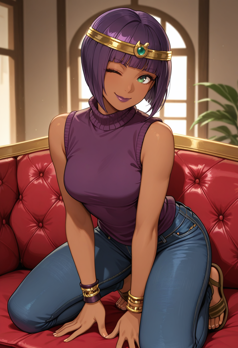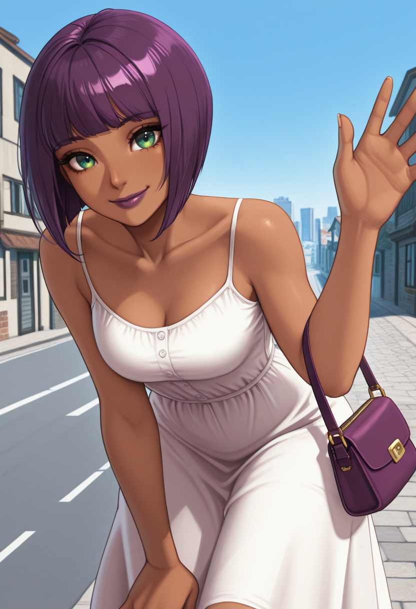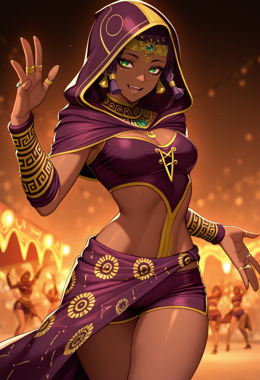 "SFVMAT、肌の黒い女性、短い髪、ボブカット、紫の髪、輪飾り、緑の目、紫の唇、ウセクネックレス、ボディスーツ、おへそ開き、紫のショール、太ももハイ、金のブレスレット、指なし手袋"