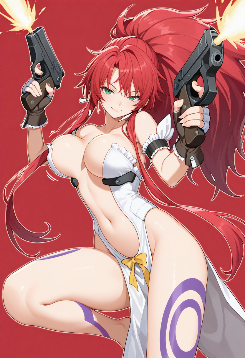 "H1M3VP、赤髪、大きな髪、ポニーテール、長い側髪、緑の目、イヤリング、露出度の高い服、中央開き、へそ、腕輪、フリル、指なし手袋、脚のタトゥー、黄色いリボン、腰巻"