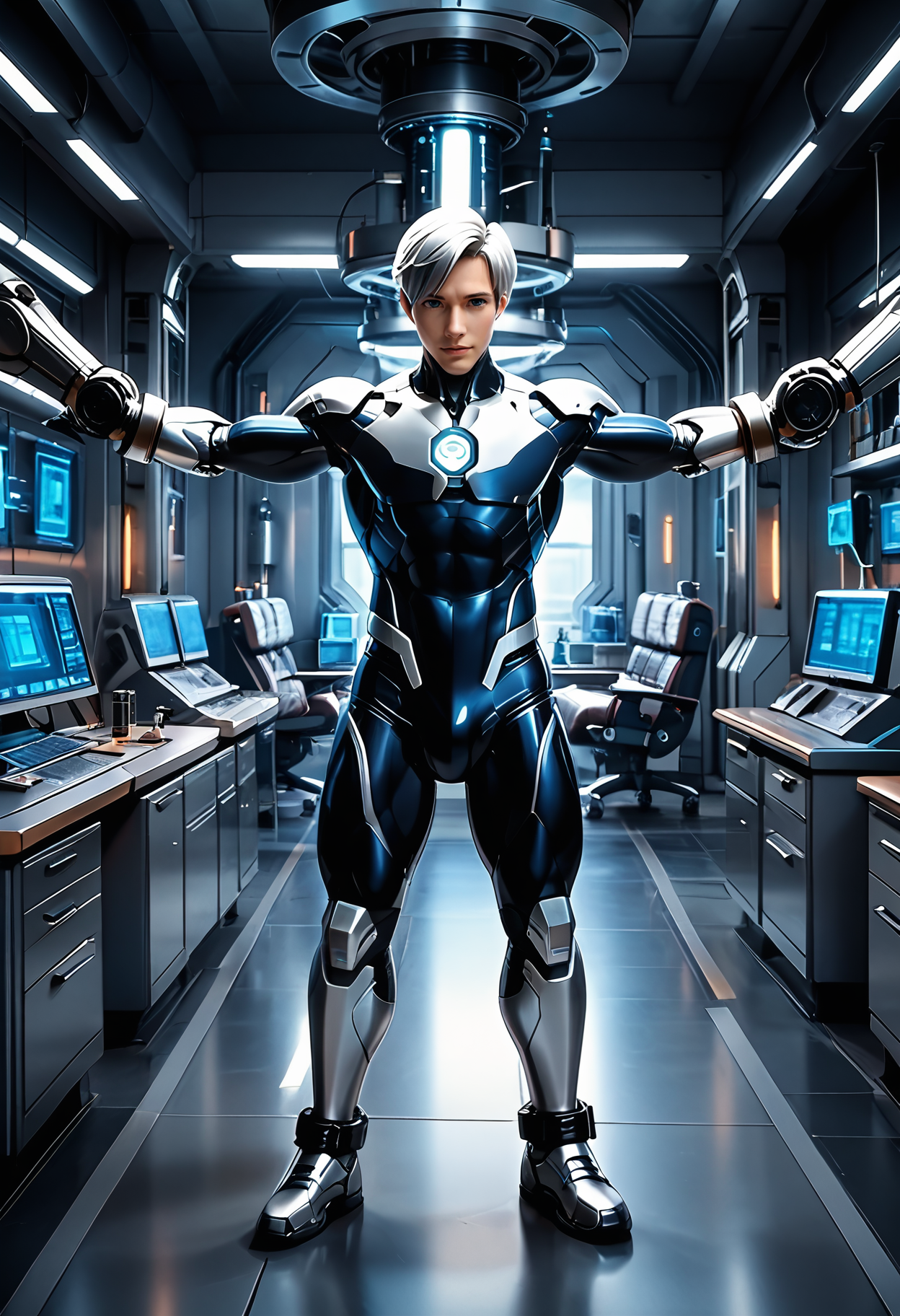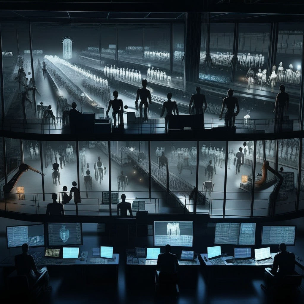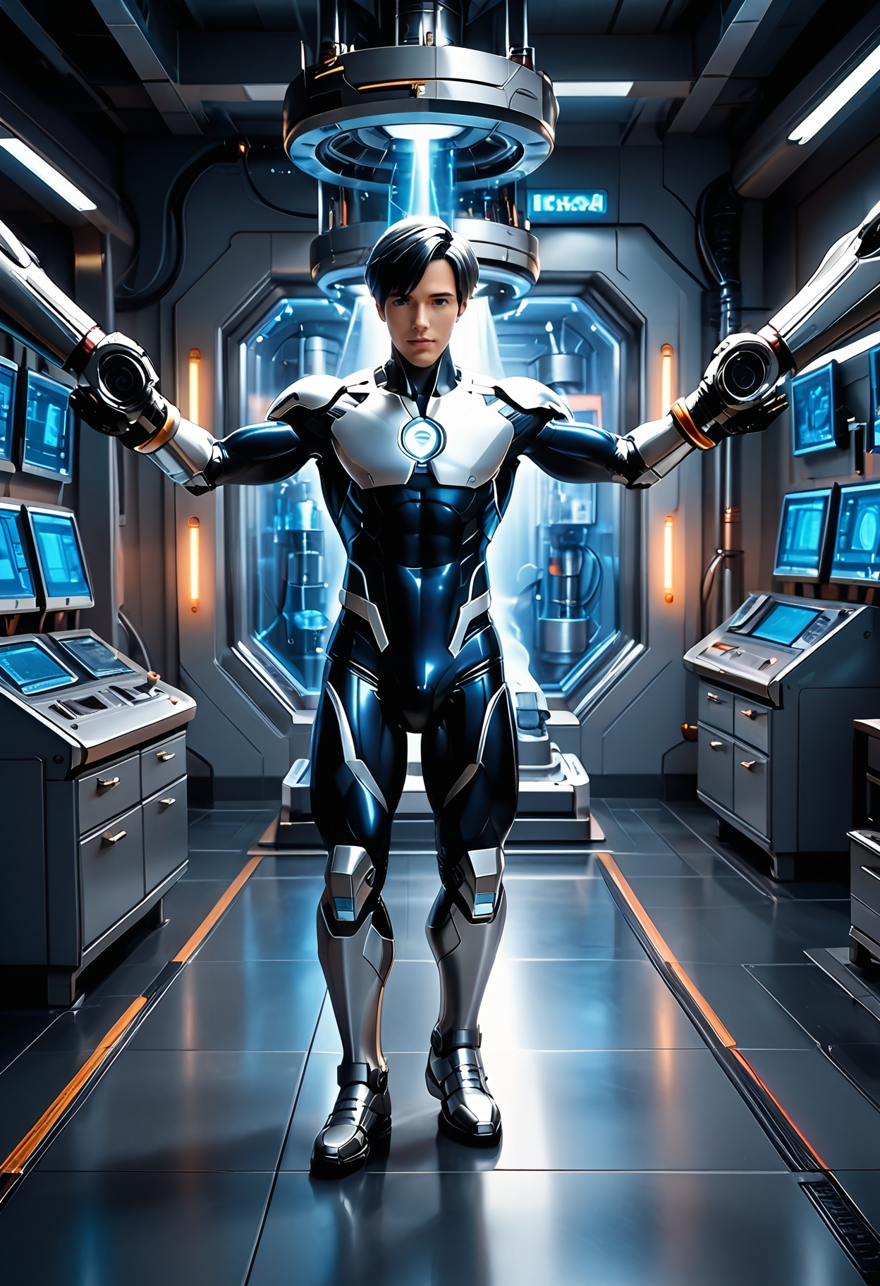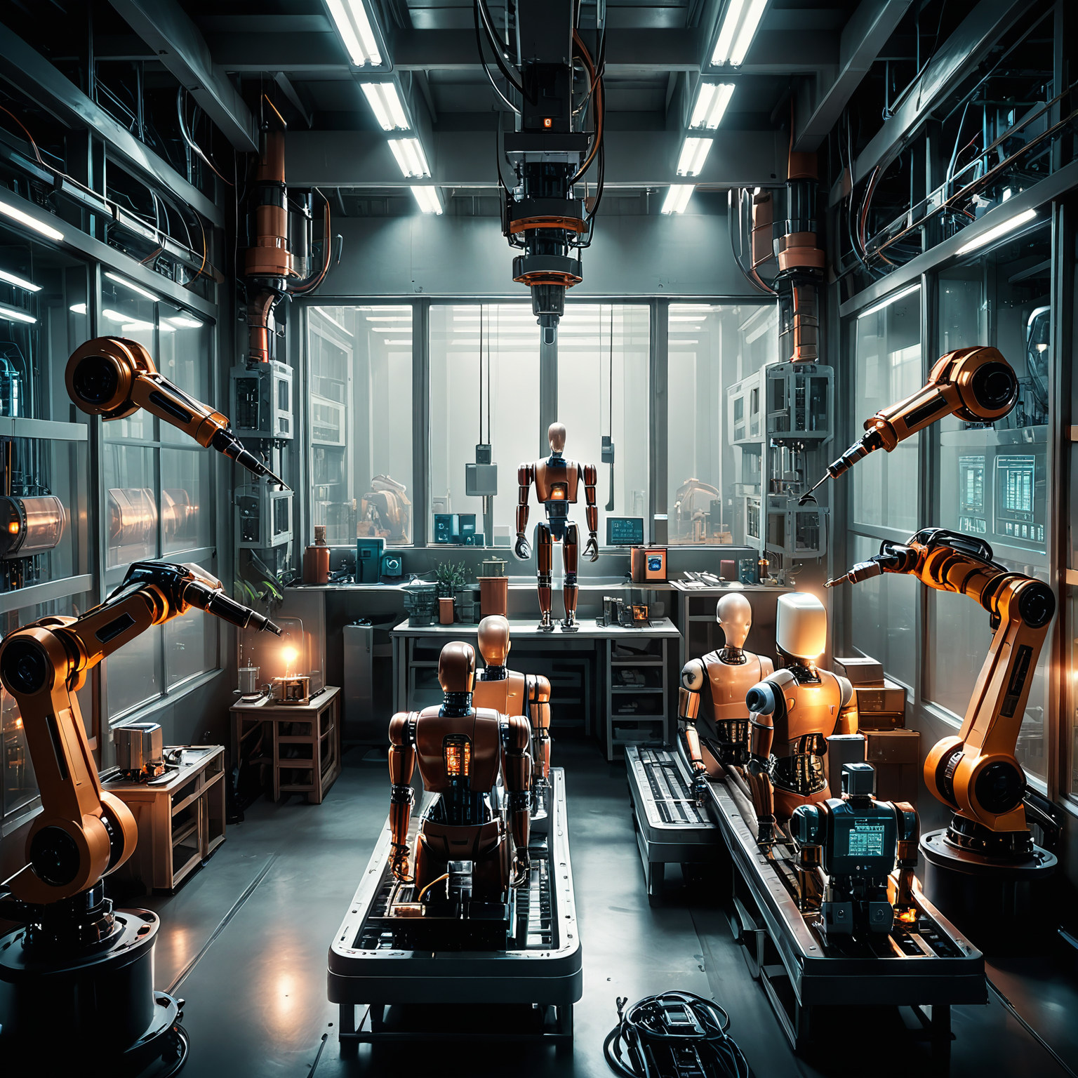無限に輝く組立ライン ⚙️🔄、精密なロボットアームがリアルなアンドロイドの体を溶接 🦾🤖、驚異的な半完成型人間型ロボットで満たされたコンベヤーベルト 😍🔩、ネオンブルーに点滅するホログラフィックディスプレイ 📊🩸、あらゆるところに飛び散る火花 ⚡🔥、クールなサイバー光に包まれた滑らかで無菌的なホール 🌐💿——すべてがハイパーディテールなSF的完璧さで描かれています!🚀🖤