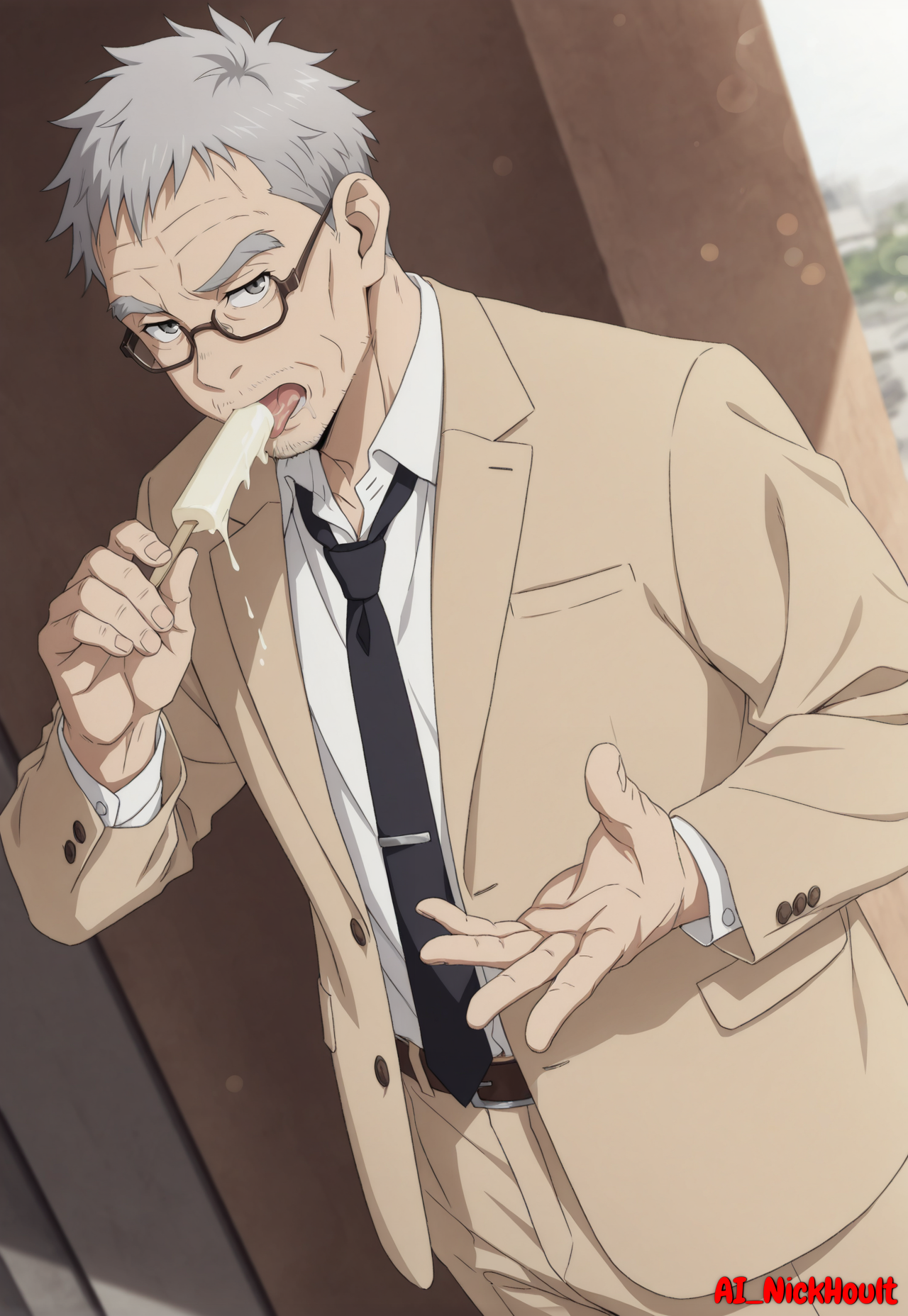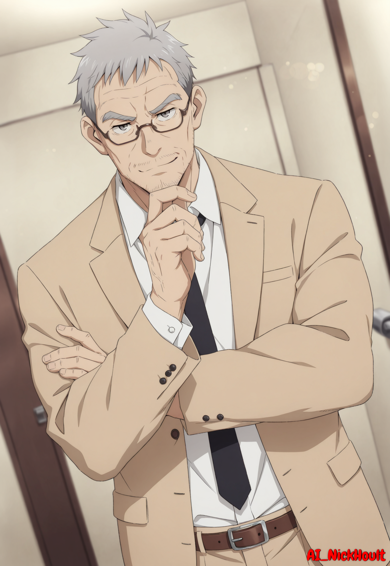 glasses, beige jacket, beige trousers, white shirt, black tie, brown shoes