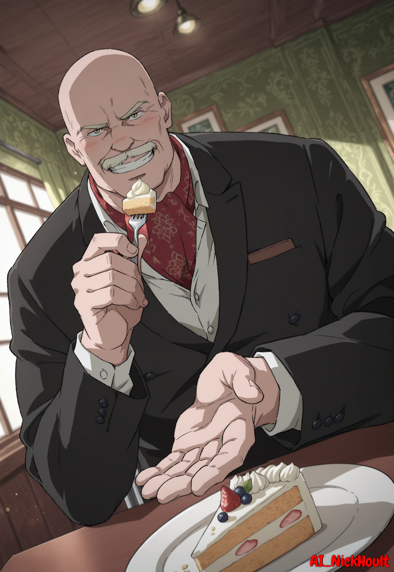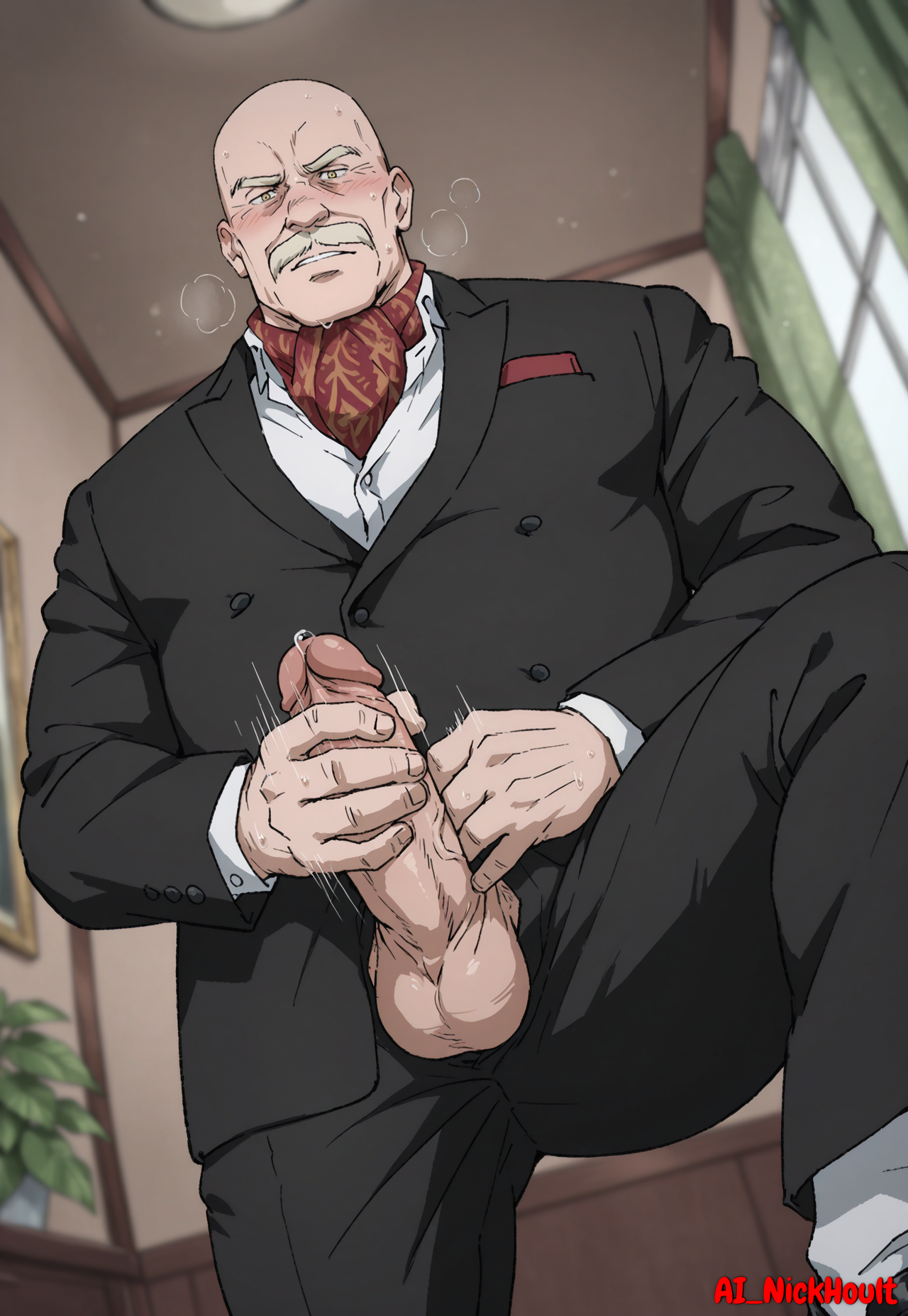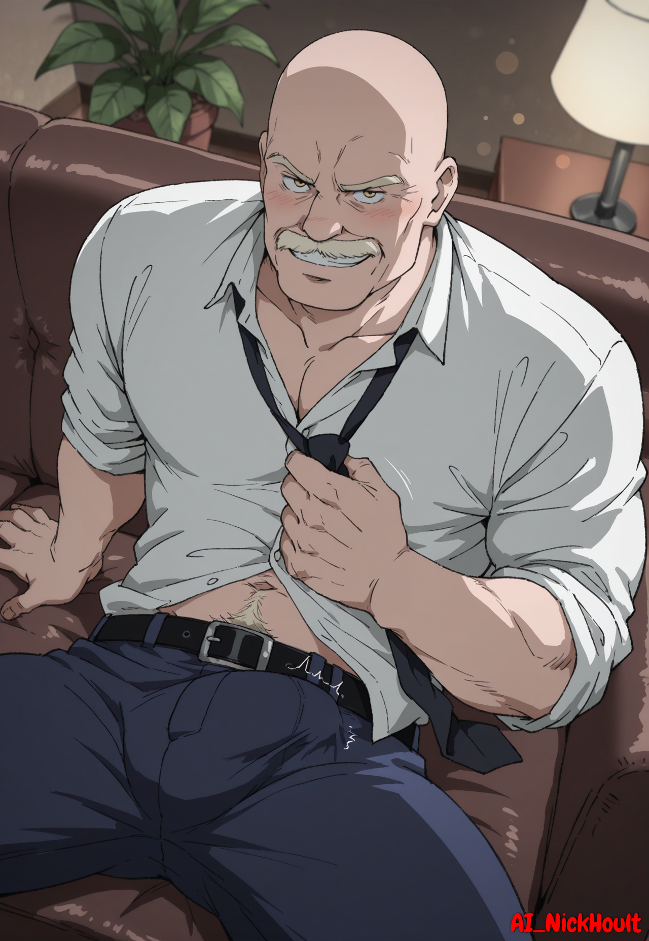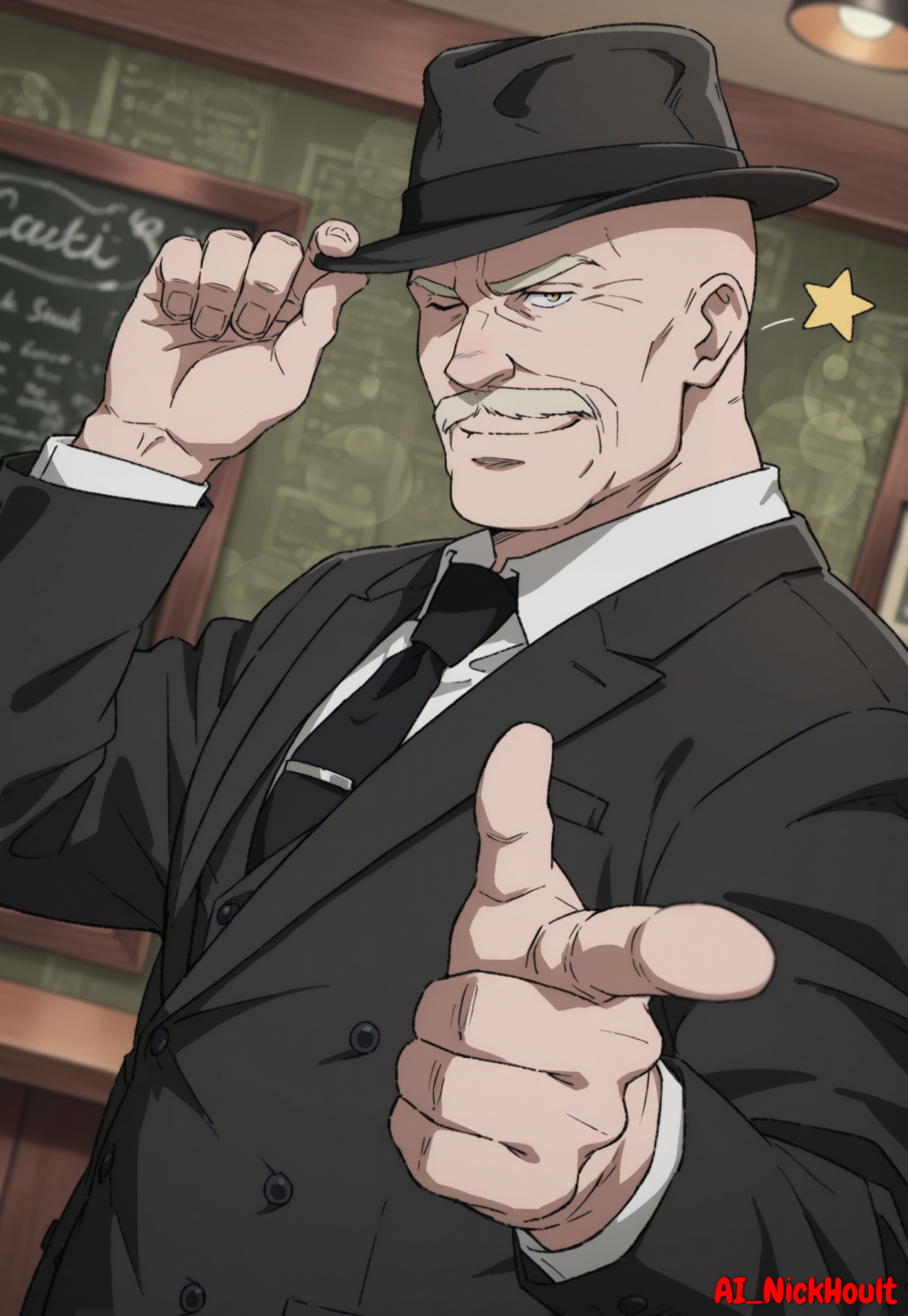 Dino_Golzine, bald, old man, wrinkles, blond eyebrows, blond facial hair, yellow eyes,