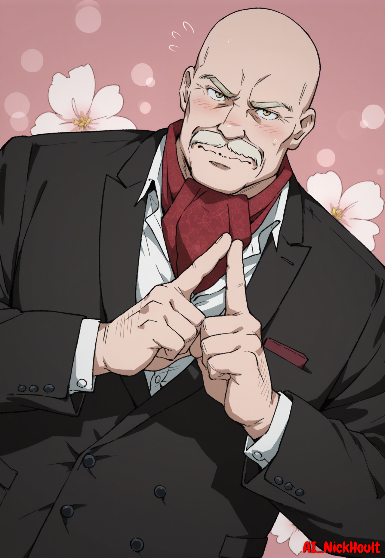 black suit, white undershirt, red scarf,