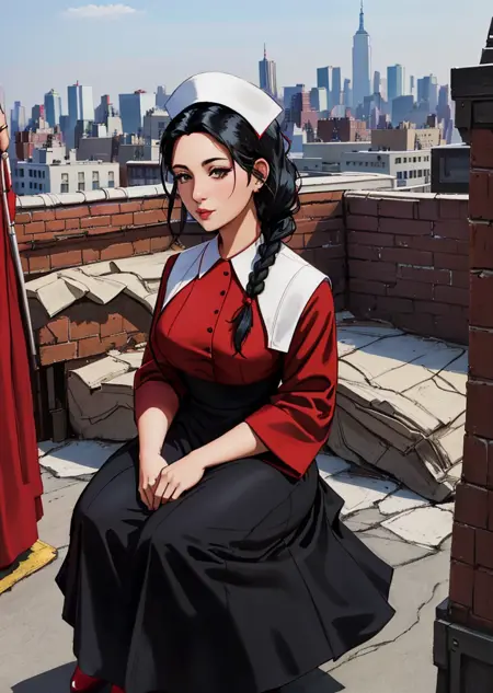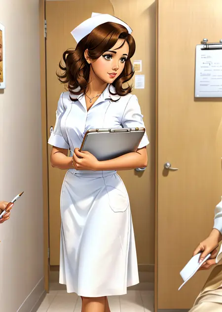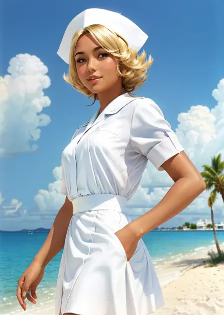 由于所有训练图像均为穿着复古护士制服的护士,该模型倾向于将角色整体设定为全套护士制服。通常可以通过在负面提示中加入“white shirt”和“white dress”,并将“nursecap”LoRA权重降至0.5来避免这种情况。