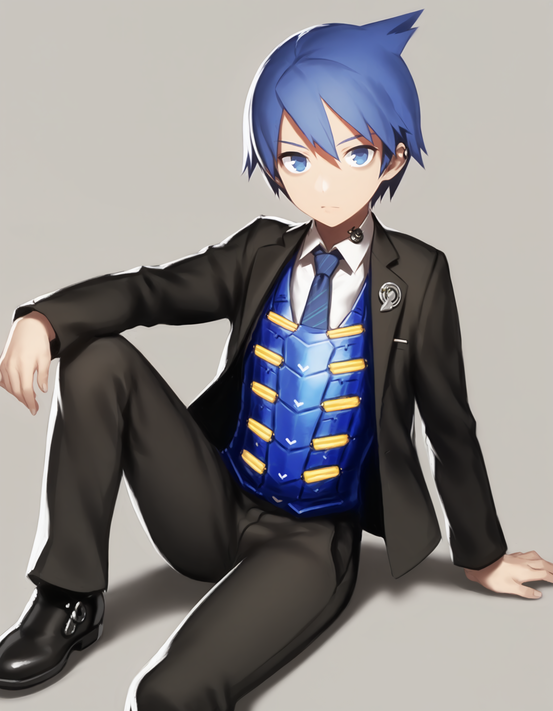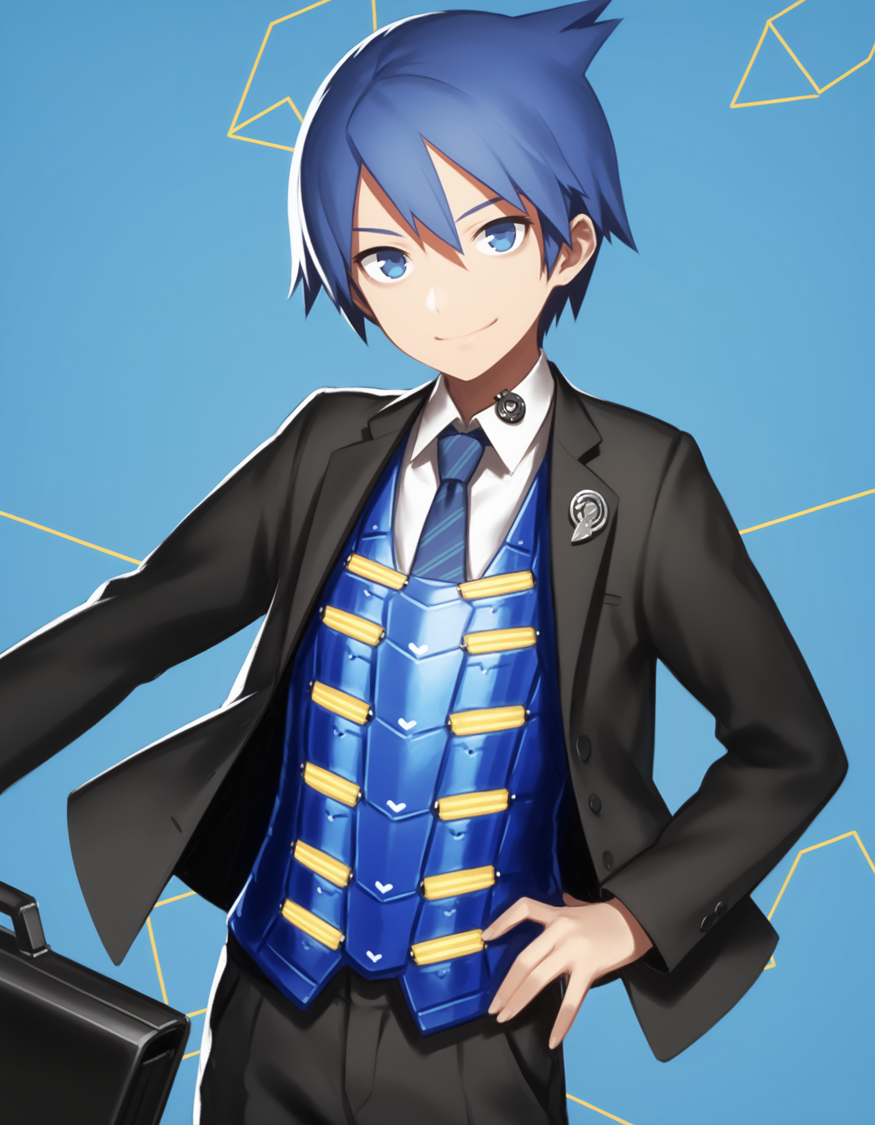 asaru,1boy,male focus,solo,blue hair,spiked hair,blue eyes,single earring,suit,black jacket,blue necktie,striped necktie,badge,white shirt,collared shirt,blue vest,black pants,black shoes,