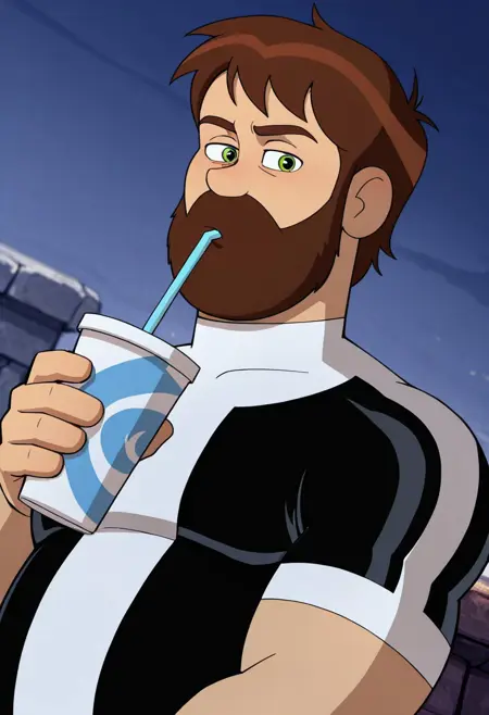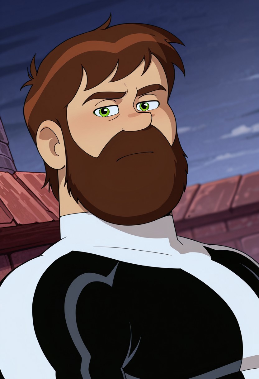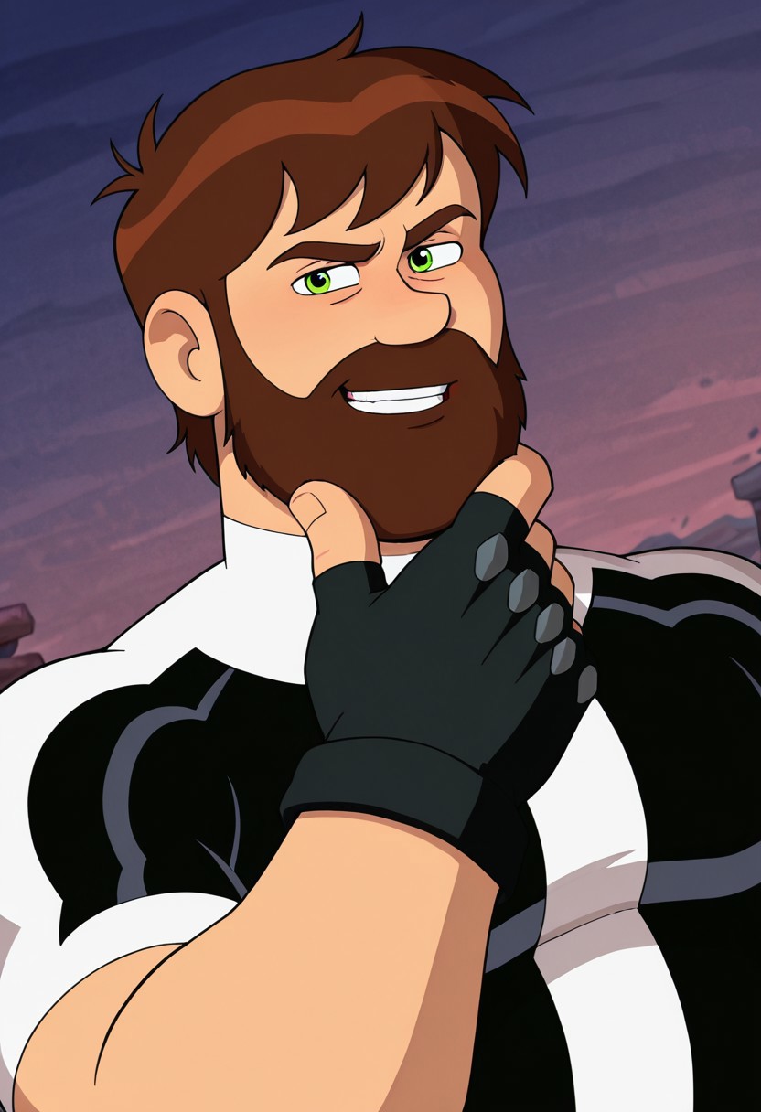 Ben10KR, 1남자, 혼자, 남성 중심, 녹색 눈, 갈색 머리, 단발, 안면 털, 수염, 셔츠, 벨트, 바지, 오미트릭스, 견갑, 기계식 팔찌, 장갑, 손가락 없는 장갑,