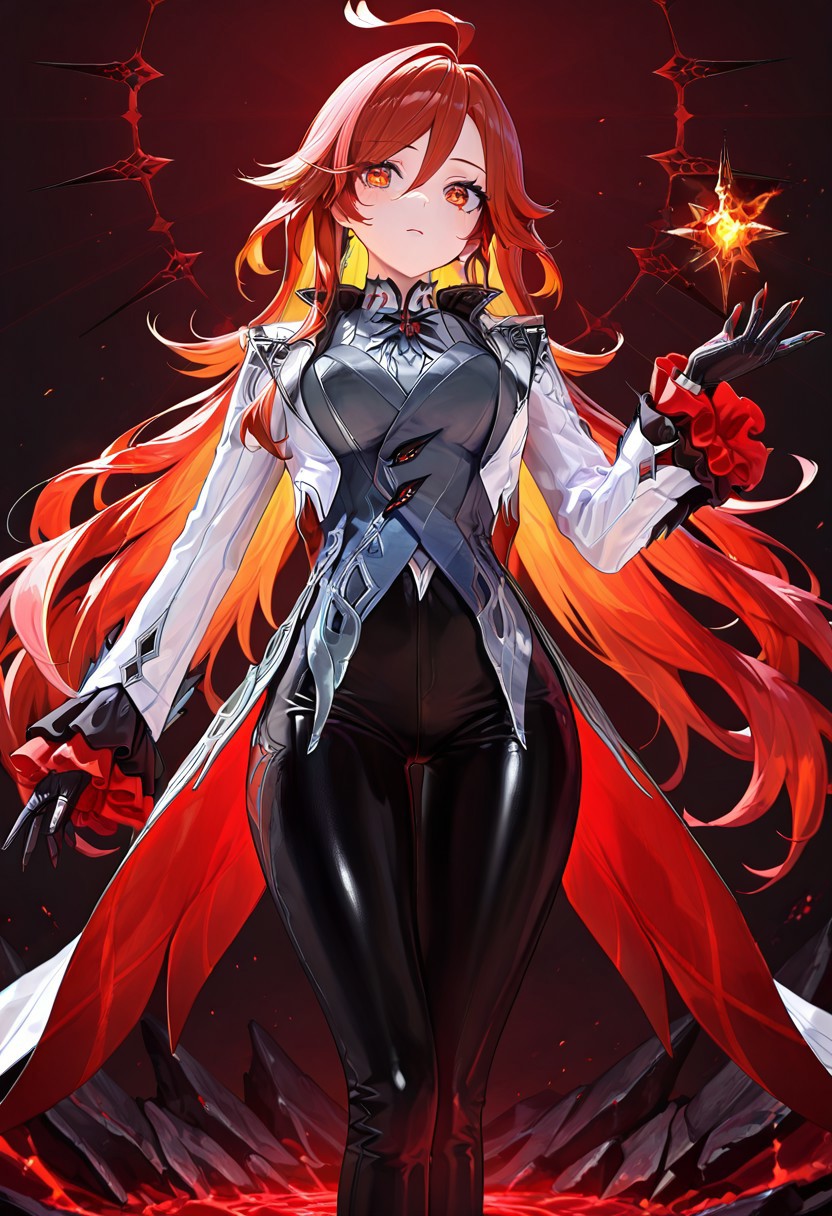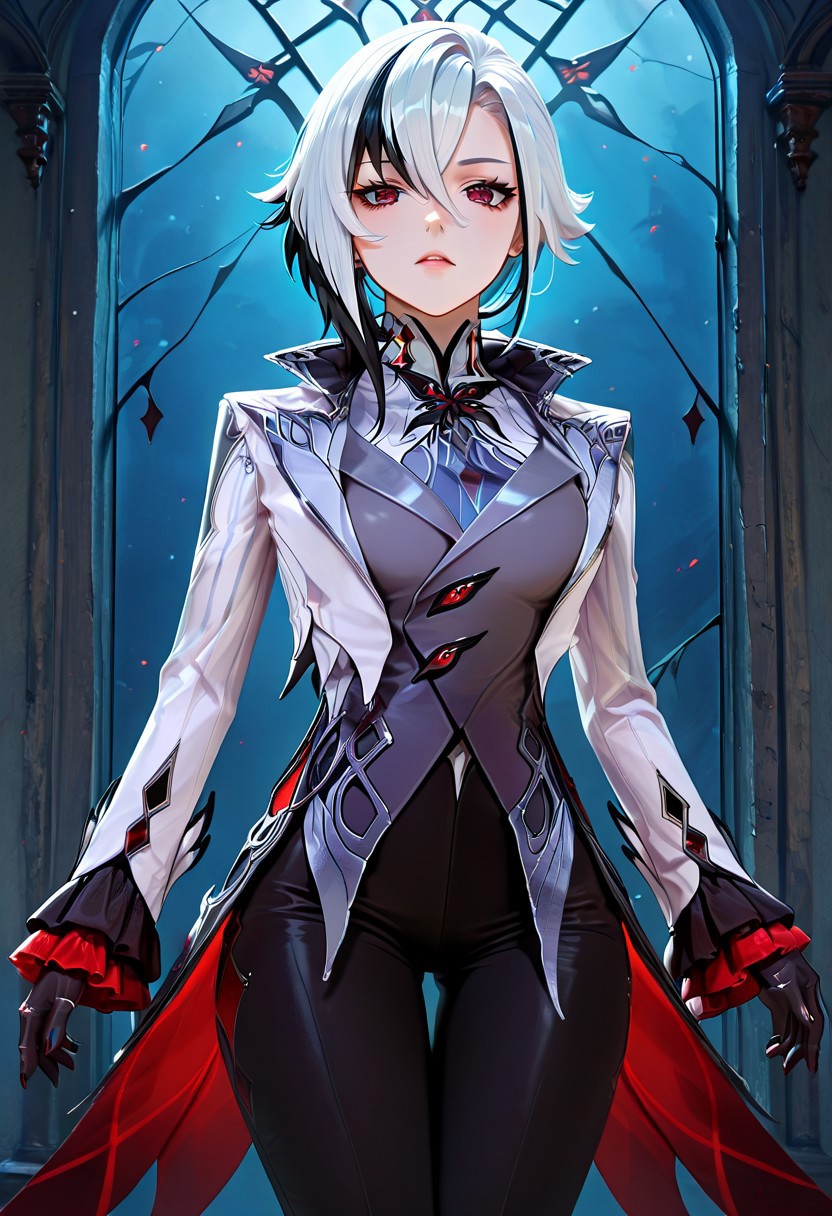 arlcchnoclstyl, long sleeves, gloves, jewelry, jacket, black gloves, pants, vest, black pants, white jacket, fitted jacket, thigh gap, grey vest, coattails, pant suit, shirt, open jacket, grey shirt, frilled sleeves, tight pants, suit, heels