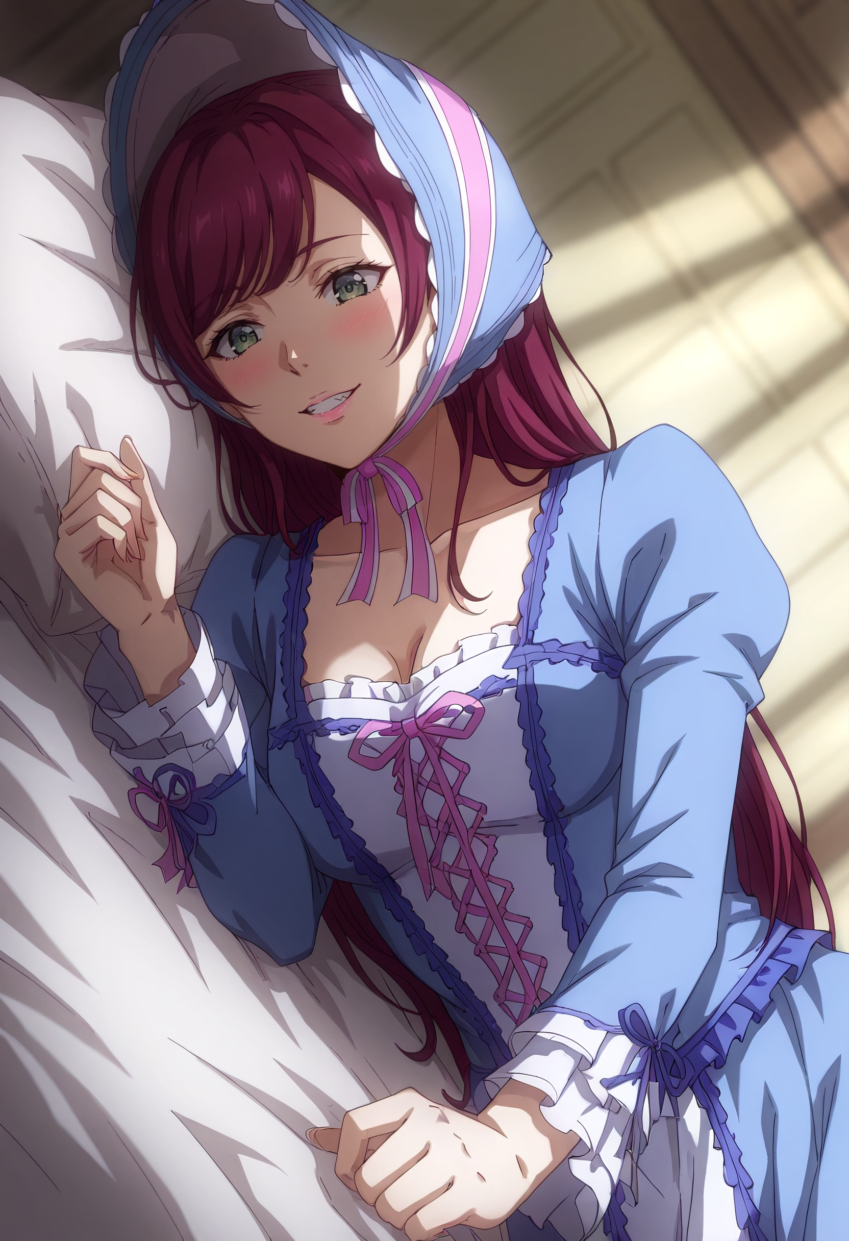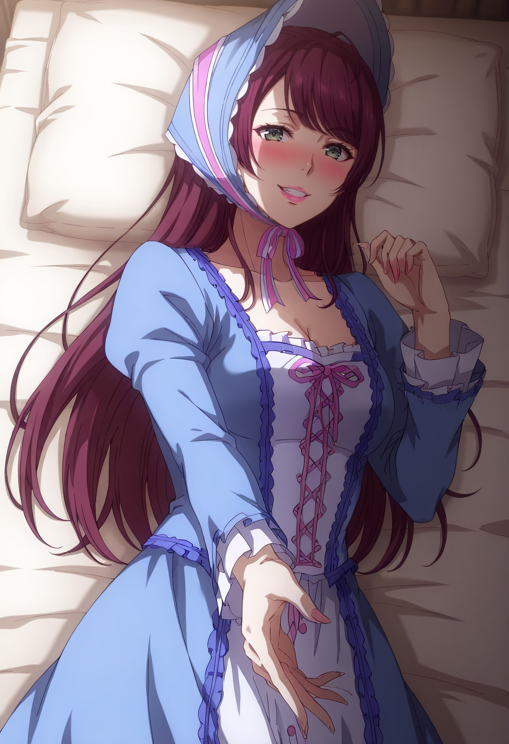 AnnaOutfit, 모자, 드레스, 빅토리아 스타일, 긴 소매, 풍성한 소매, 가슴 노출, 재킷, 프릴, 파란 드레스, 리본, 프릴 드레스, 모자, 줄리엣 소매, 턱끈,