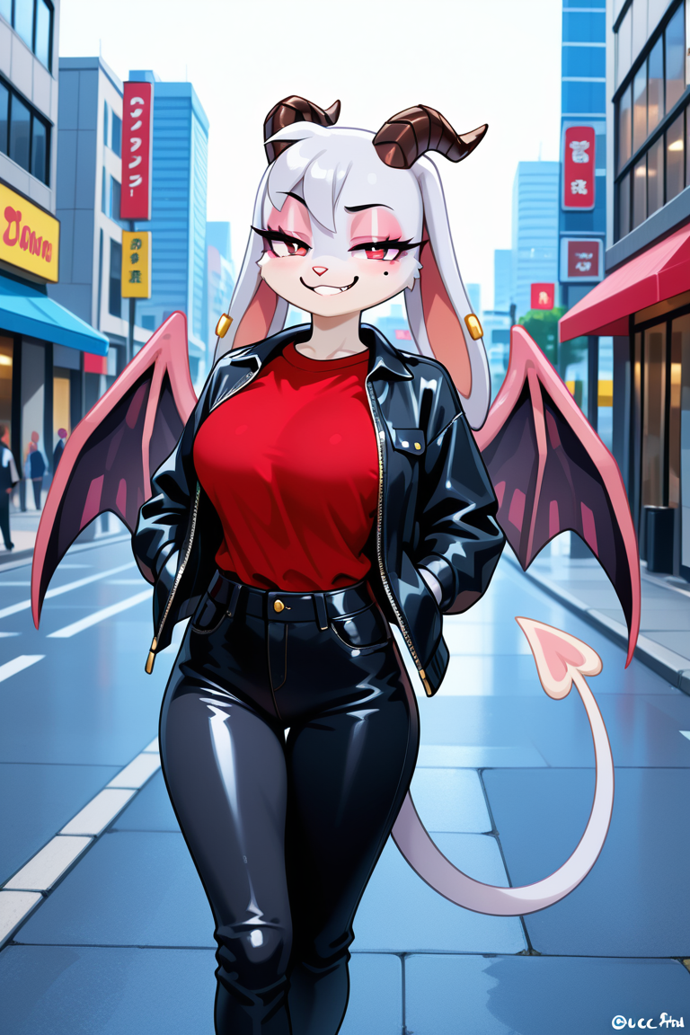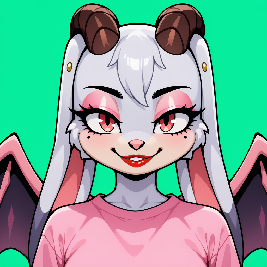 タグ:suc、anthro、フューリーな女性、ウサギ娘、デーモンの尾、コウモリの翼、茶色い角、ウサギの耳、グレーの毛、薄茶色の肌、ピンクのアイシャドウ、赤いリップ、ゴールドの耳 piercing、目下のほくろ