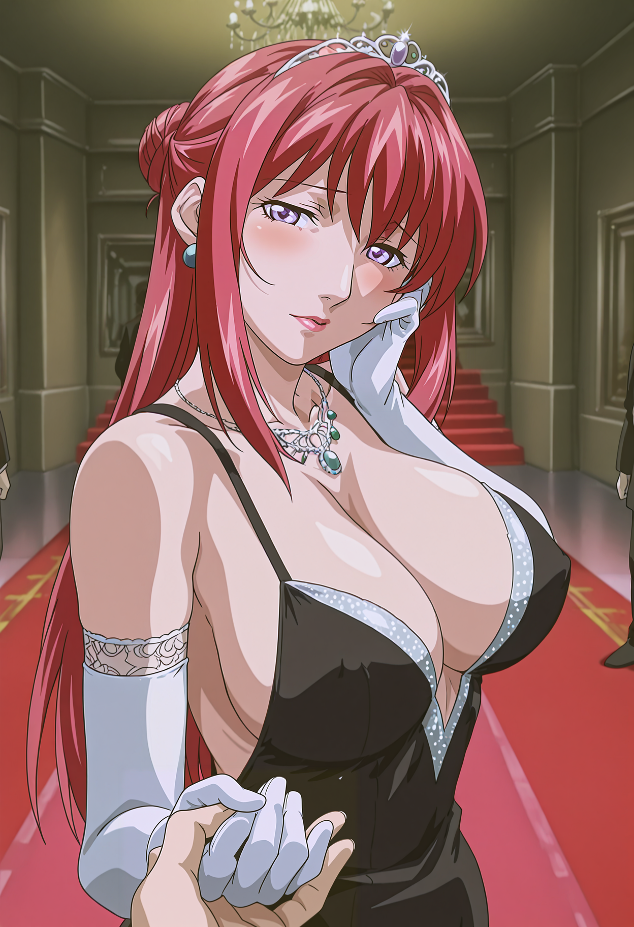 taka_outfit, 紫色のブレザー, 白いシャツ, ポロシャツ, 黄色いボウタイ, 赤いペンシルスカート, 黒いシンクストッキング, ガーターベルト, 黒いハイヒール,