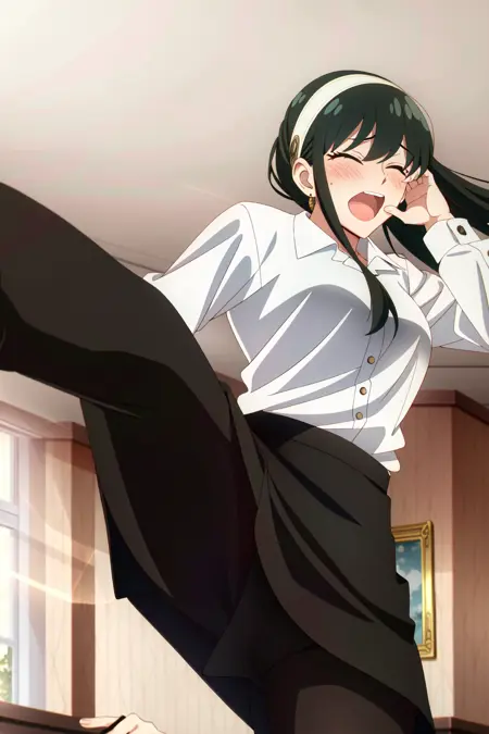 约尔·福杰、红眼、发带、黑发、外套、靴子、丝袜、侧发、白色发带、黑色丝袜、长发、站立、长袖、刘海