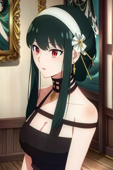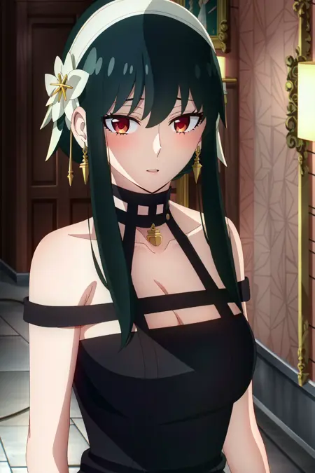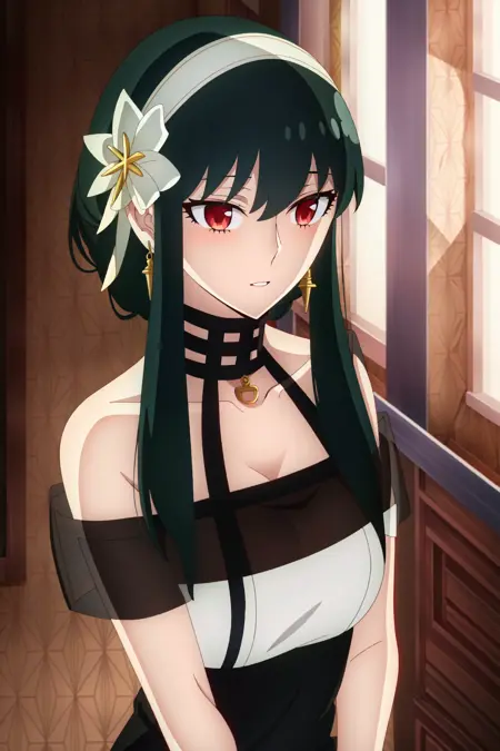 约尔·福杰、连衣裙、手持、黑色连衣裙、黑发、武器、高跟鞋、过膝袜、红眼、双面布料、高跟靴、靴子、发带、手持武器、手套、双持、乳房、发饰、花朵、双面裙、短刀、无指手套、黑色手套、侧发、匕首、大腿靴、注视观众、发饰花、黑色鞋履、玫瑰、裸露肩部、黑色过膝袜、手持短刀、站立、长发、金色发带、玫瑰图案、手持匕首、耳环、无袖、长发与短发并存、珠宝、闭嘴、刘海、无袖连衣裙