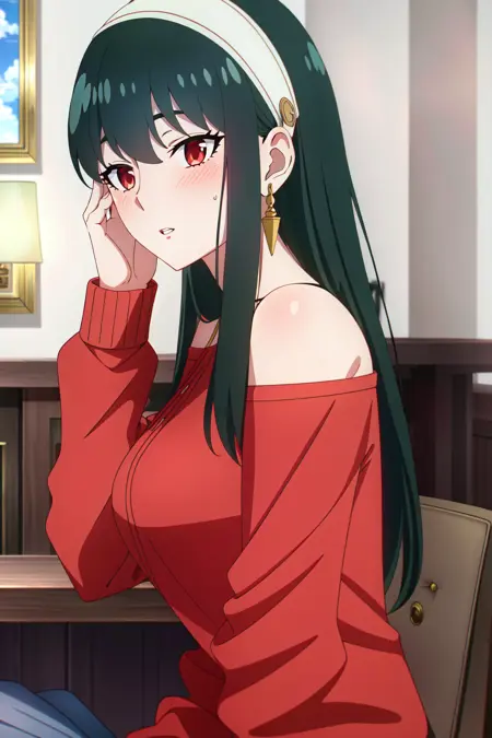 约尔·福杰、珠宝、黑发、耳环、红眼、发带、毛衣、微笑、红色毛衣、长发、锁骨、刘海、连衣裙、毛衣裙、中等胸部、乳房、金色耳环、长袖、露肩毛衣