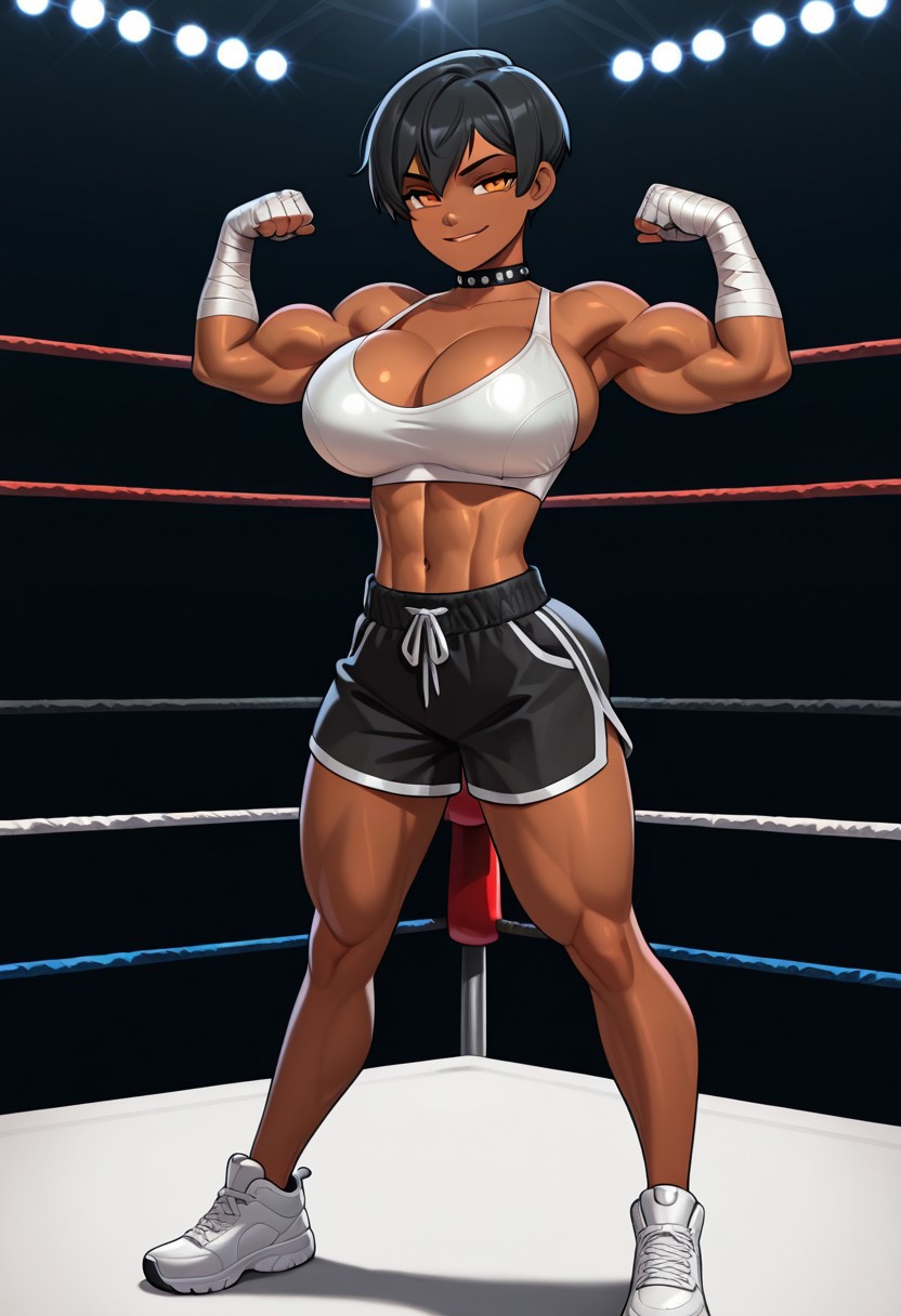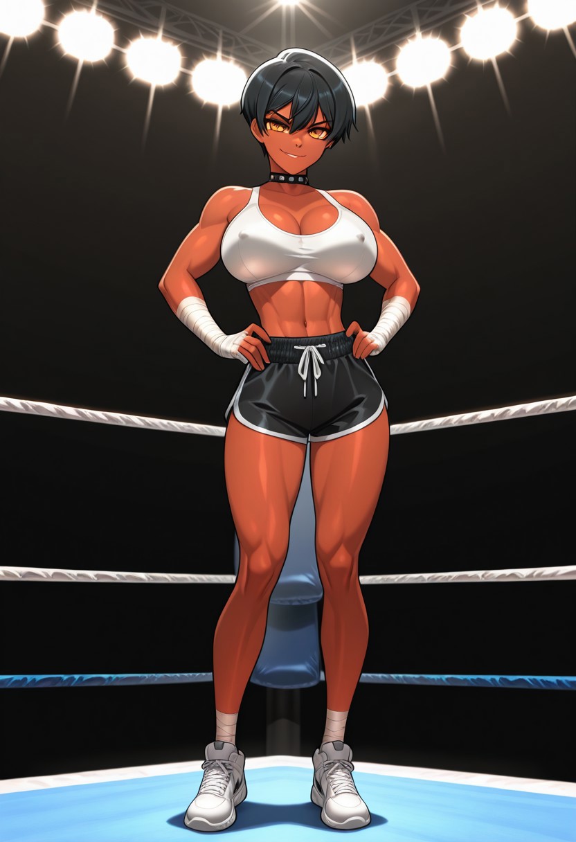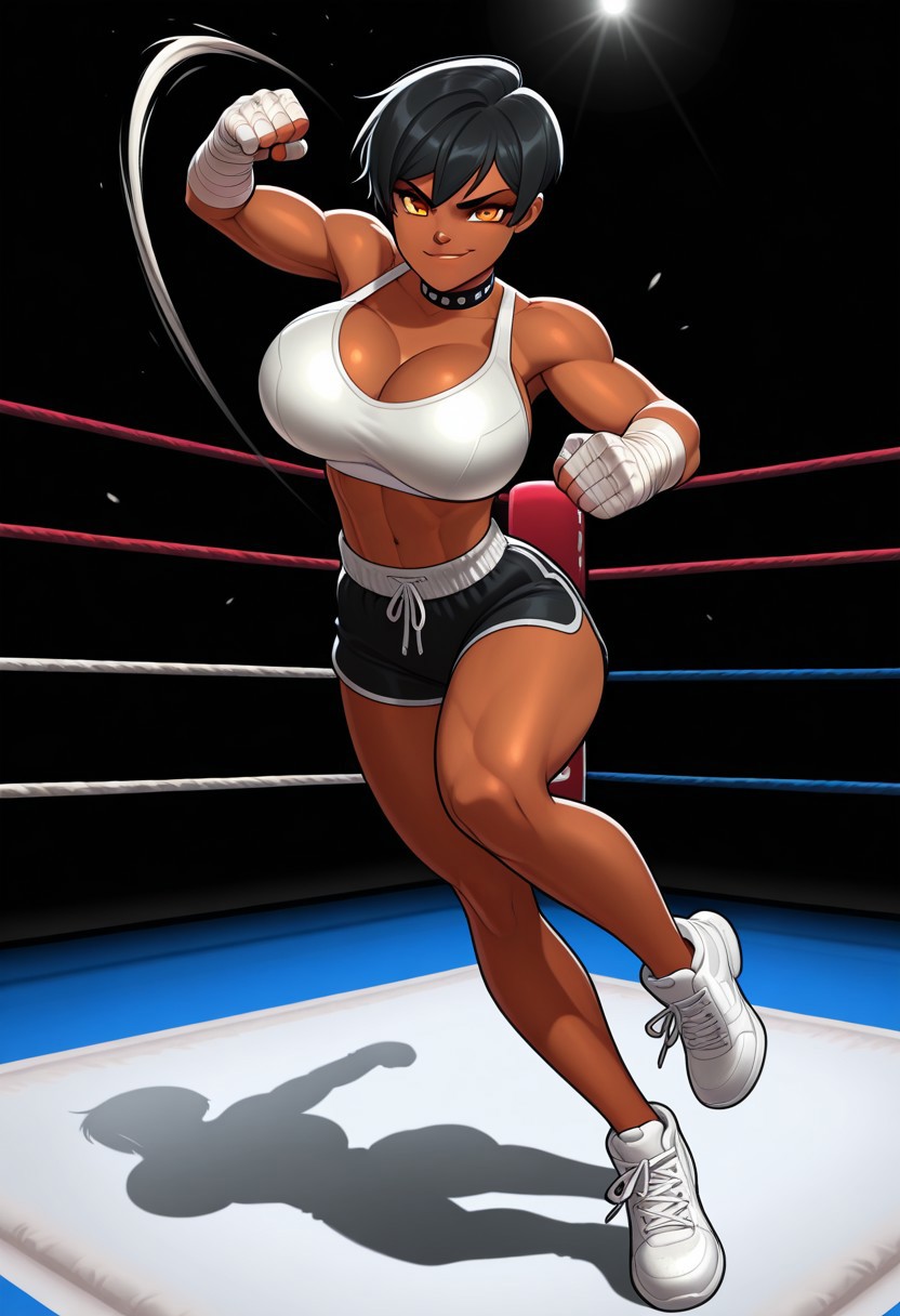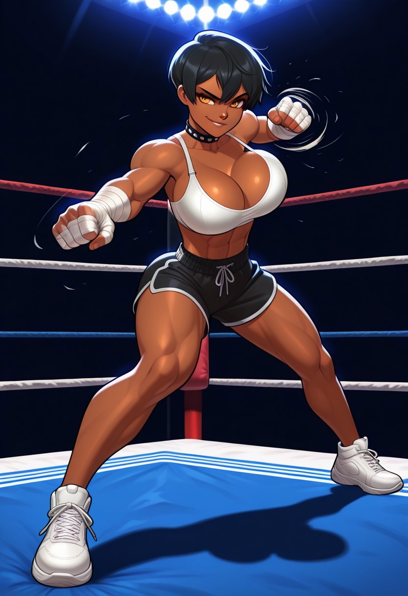 トリガーは レディーボクサー、美しい顔、琥珀色の目、暗い肌、スポーツ選手のような女性、黒いピクシーカット