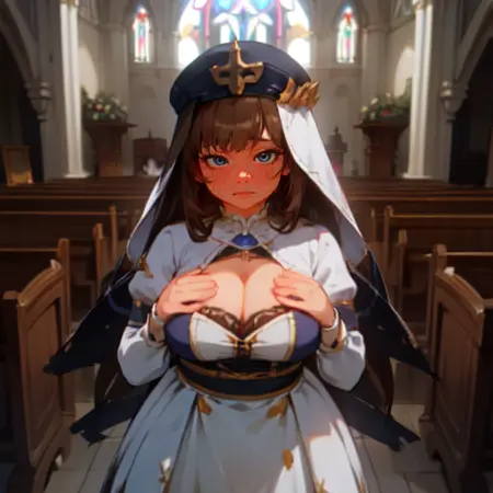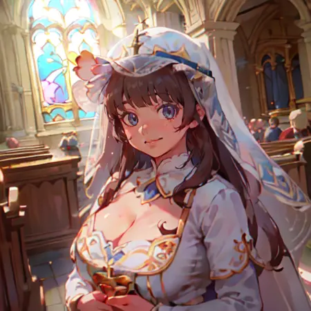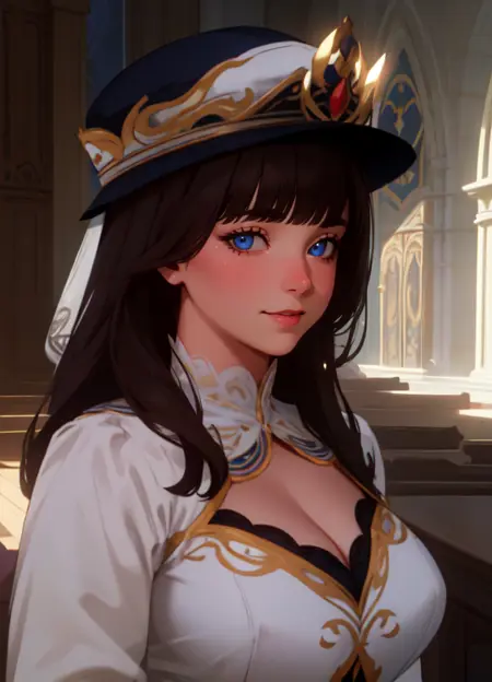 (masterpiece, best quality),(depth) of (field), lora:Jilliana:0.6 lilliana, hat, 1girl, long_hair, brown_hair, white_clothes, ornaments, long_sleeves, church, blue_eyes,large_breasts, cleavage lora:Concept_Plump:1 Chubby, Plump, looking at viewer, smile, dress, adult