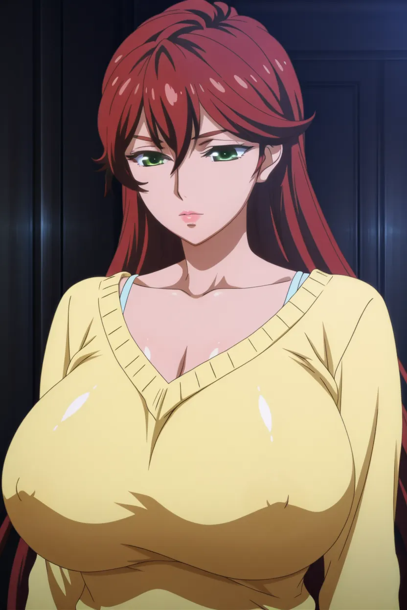 Akira Hiiragi (Valkyrie Drive Mermaid), green eyes, red hair, long hair, lips, glossy lips, thick lips, gigantic breasts, Valkyrie Drive Mermaid_art_style, 4k, HD, superb quality