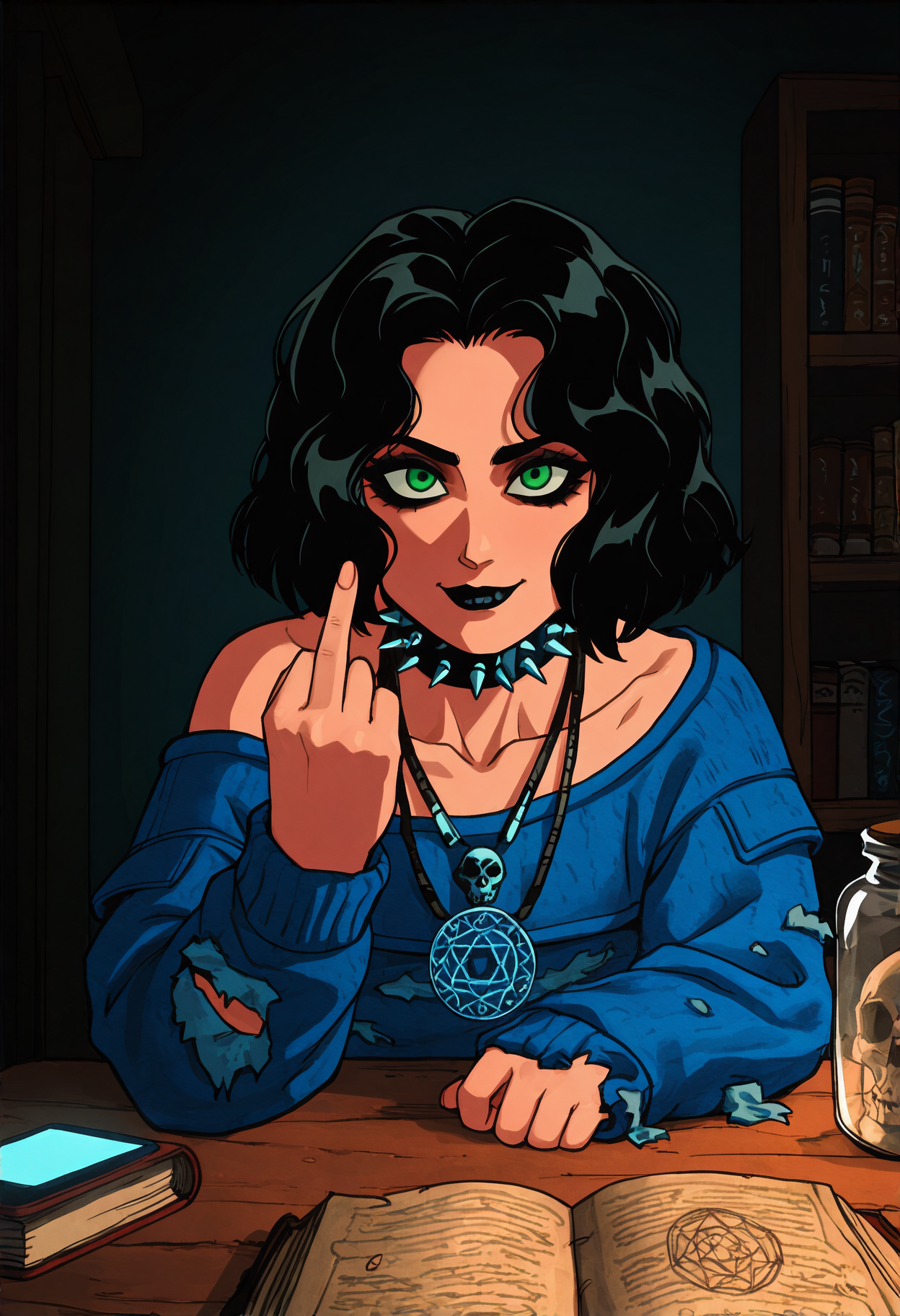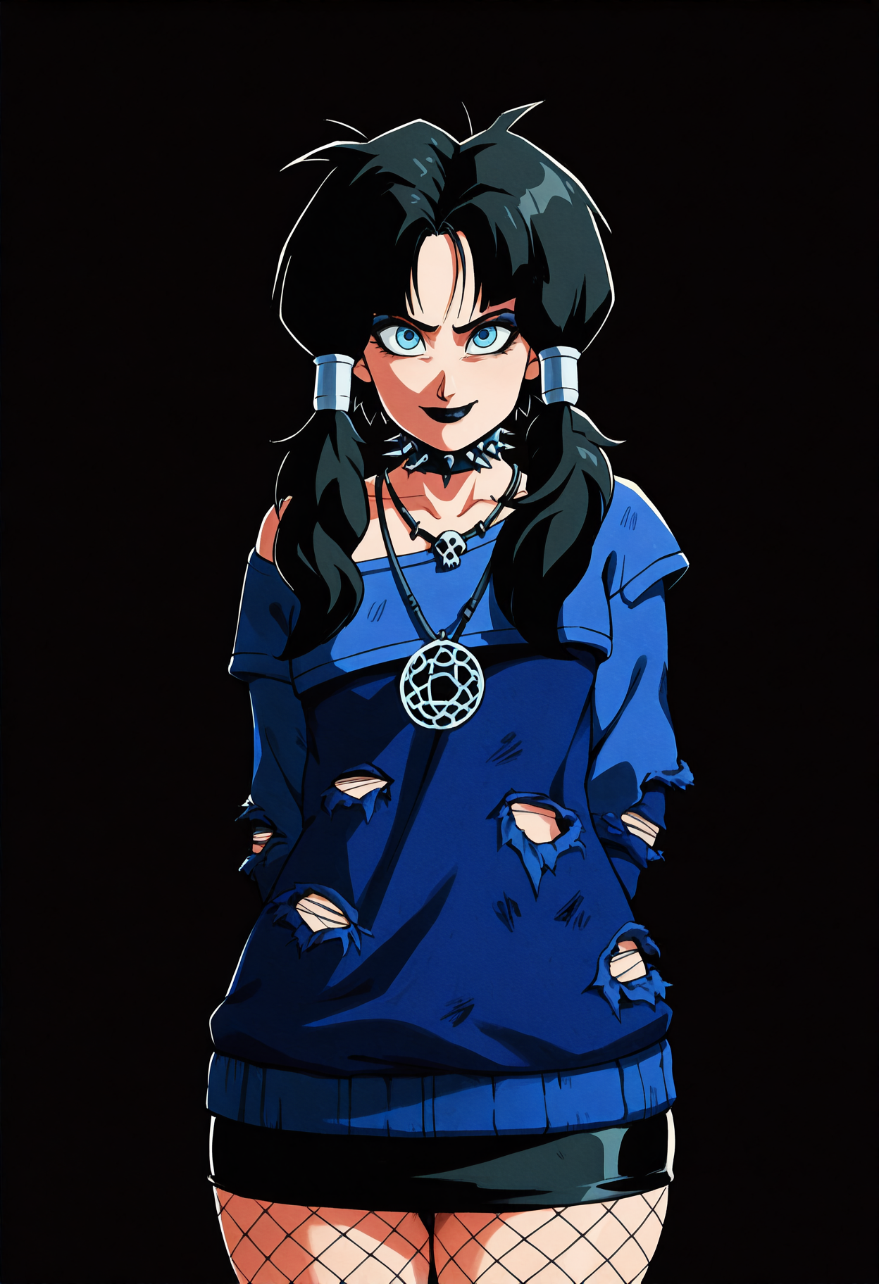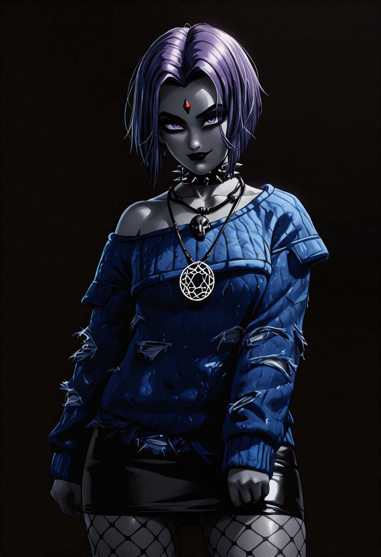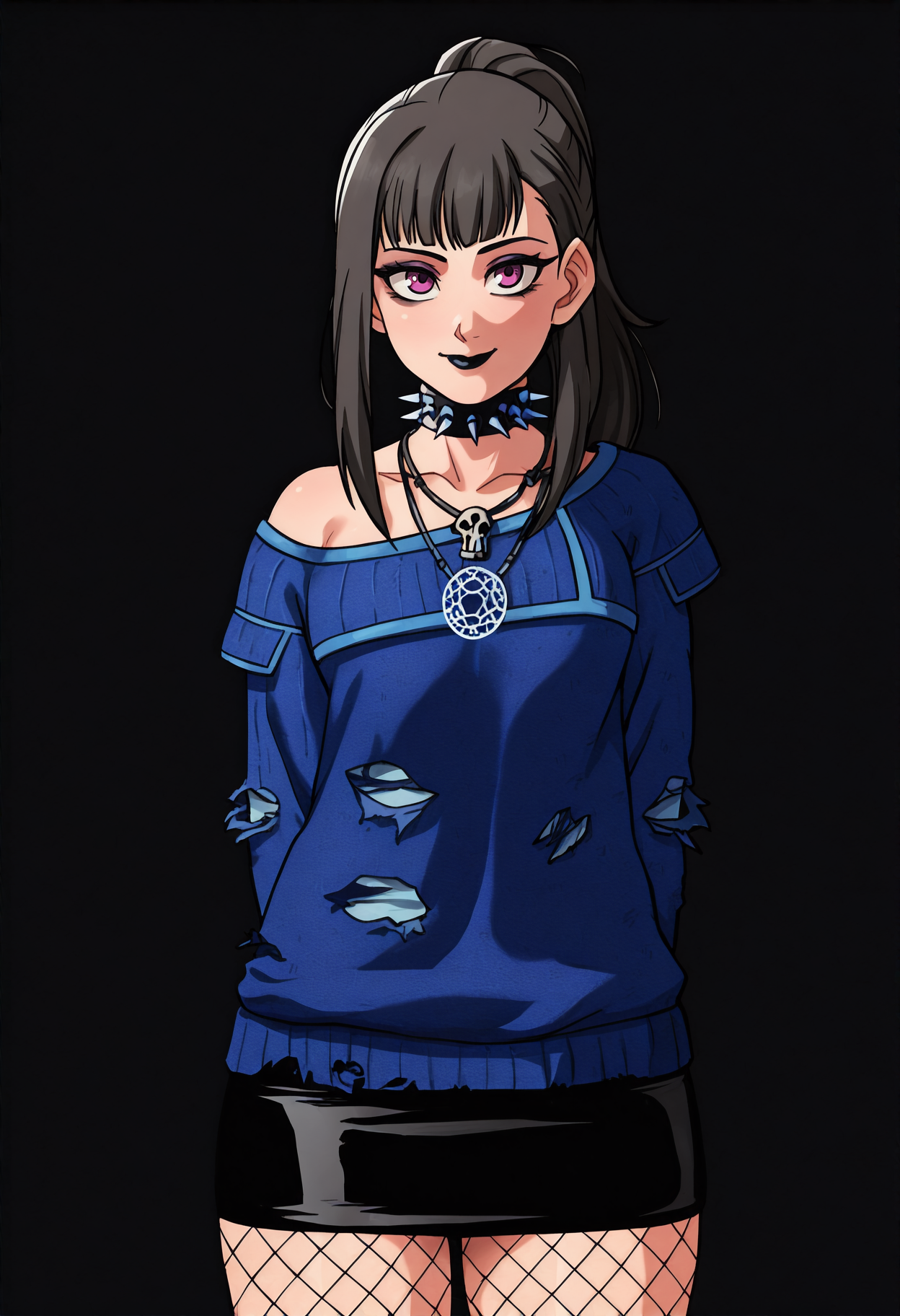 衣装: 黒いカラー、スパイクカラー、スカルネックレス、十二芒星ネックレス、青いセーター、オフショルダーセーター、破れたセーター、ロングスリーブ、黒いスカート、铅筆スカート、ミニスカート、フィッシュネットタイツ、ハイヒール、黒い靴