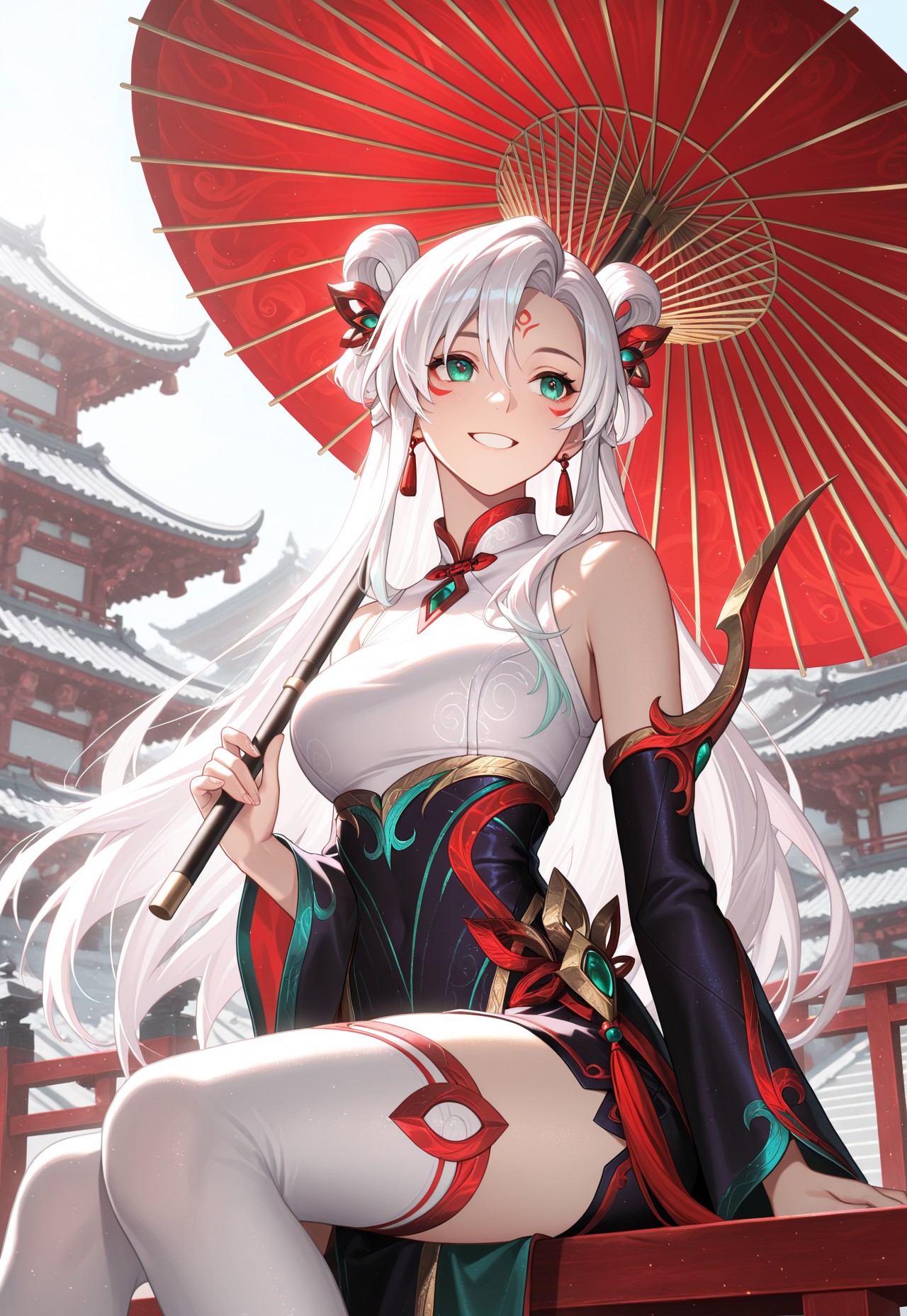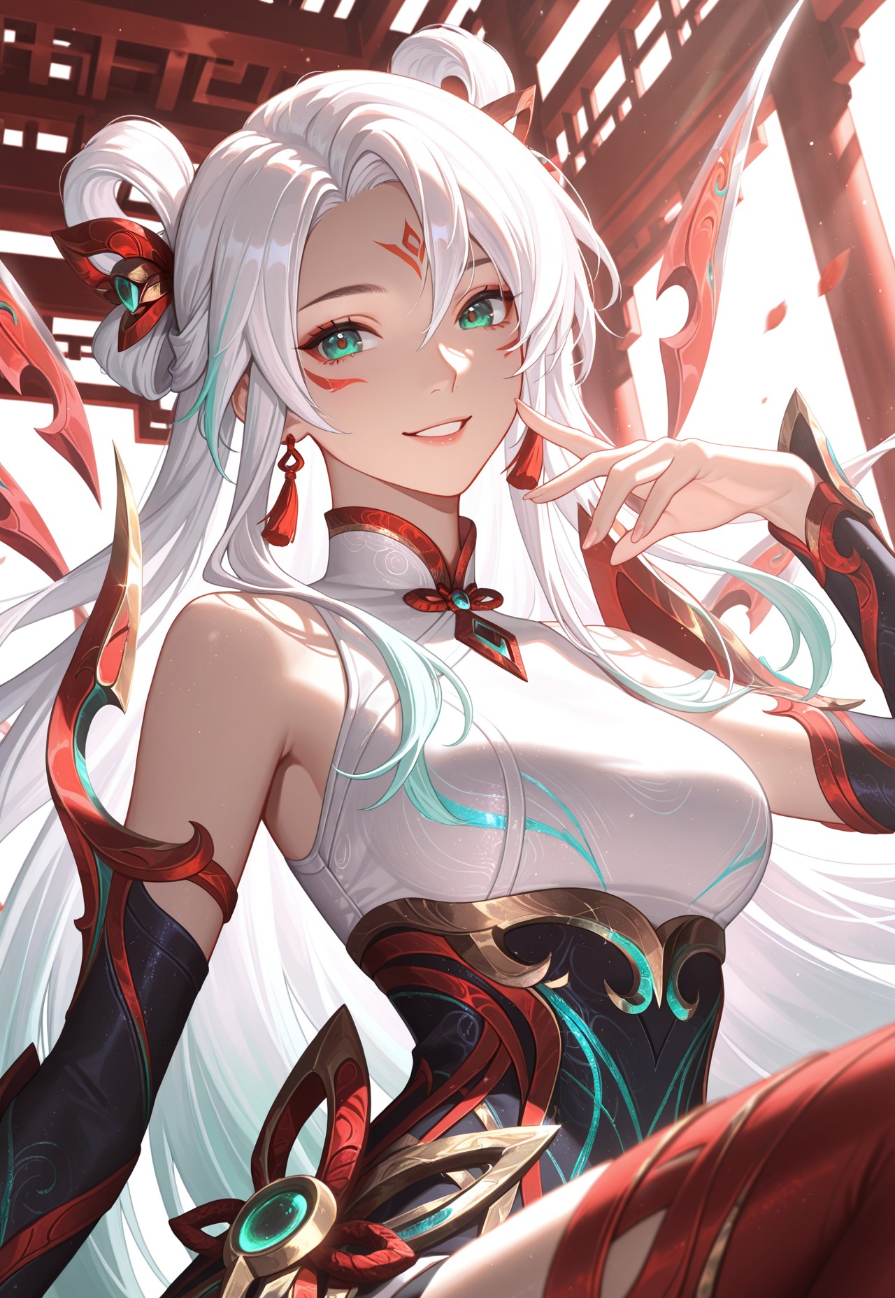 MMKirelia, long hair, white hair, twin buns, hair ornament, face marks, green eyes, jewelry, multicolored dress, Chinese outfit, bare shoulders, detached sleeves, thighhighs,