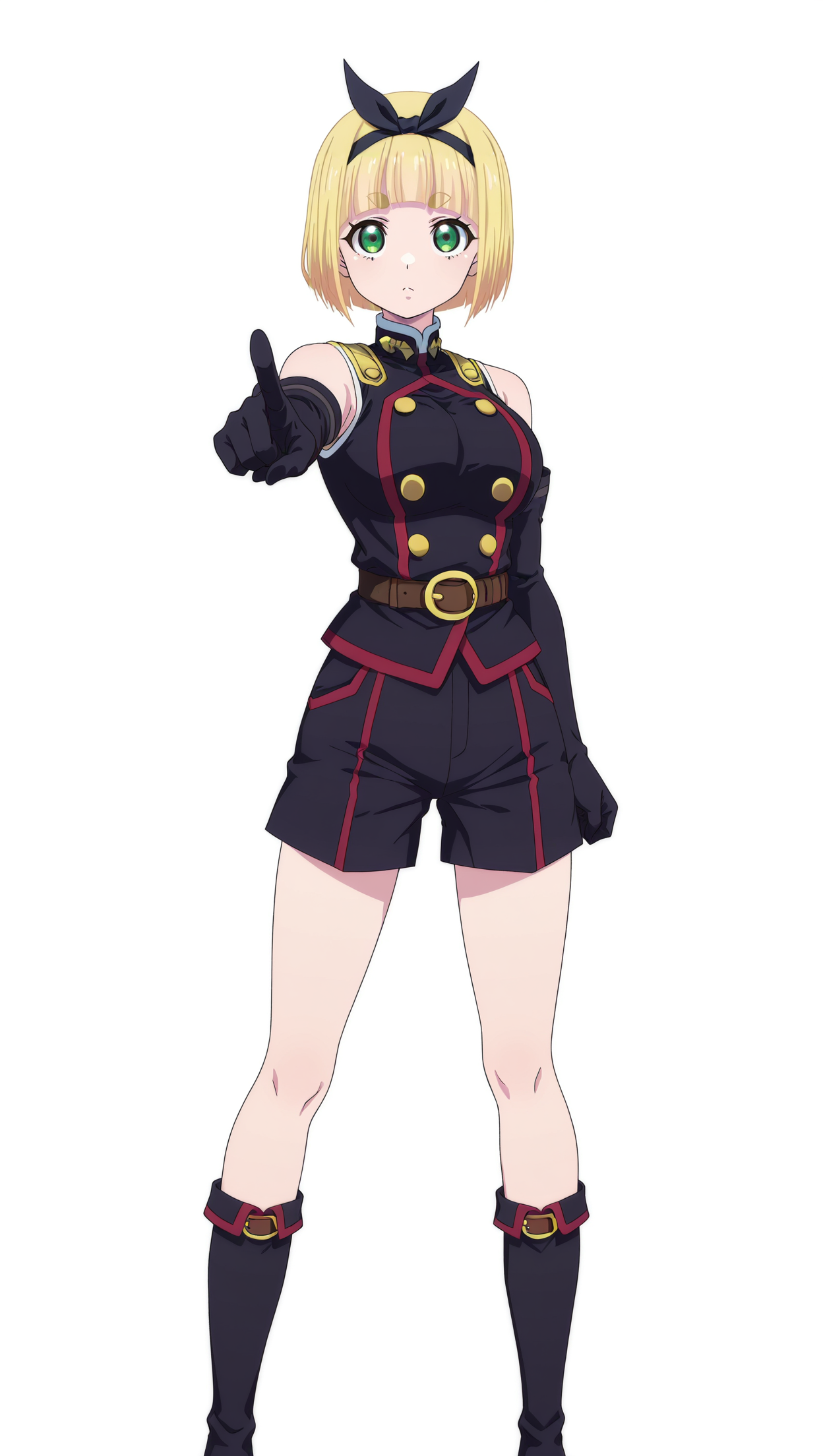 anime coloring, masterpiece, best quality, amazing quality, 5urug45hu5hu, 1girl, short hair, bob cut, blonde hair, thick eyebrows, green eyes, large breasts, bow hairband, black bow, military uniform, black uniform, sleeveless, elbow gloves, black gloves, belt, shorts, black shorts, boots, black footwear, solo, pose, standing, looking at viewer, from front, ((((white background, simple background))))