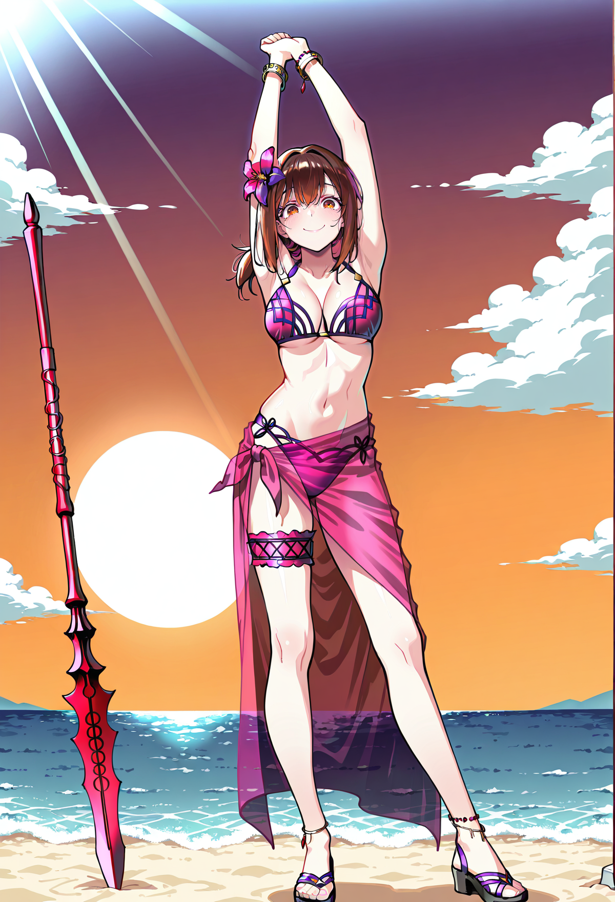 sch70asssw, ピンクの髪の花, ヒビスカス, 紫色のビキニトップ, 紫色のビキニボトム, バングル, 紫色の太ももストラップ, 紫色のサロング, アンクレット, サンダル,