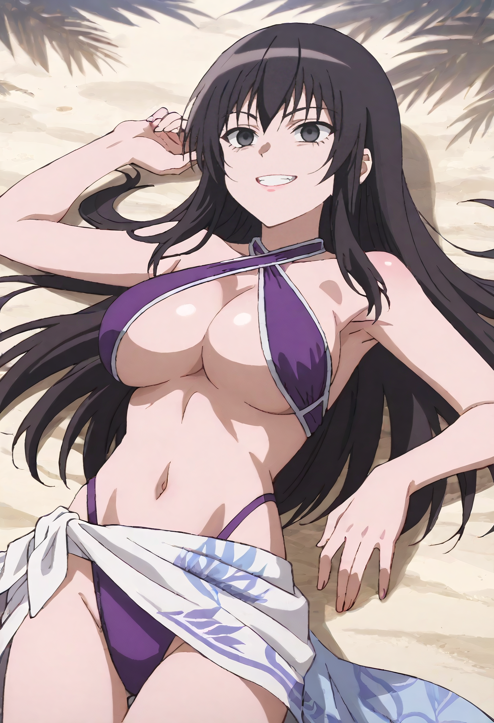 KilmariaHuSwimwear、水着、クロスハーネス、ハーネスネック、ビキニ、胸元、紫のビキニ、サロング、ハイレグビキニ、スリングトップ、アンダーブーブ、白いサロング、ハイレグ、