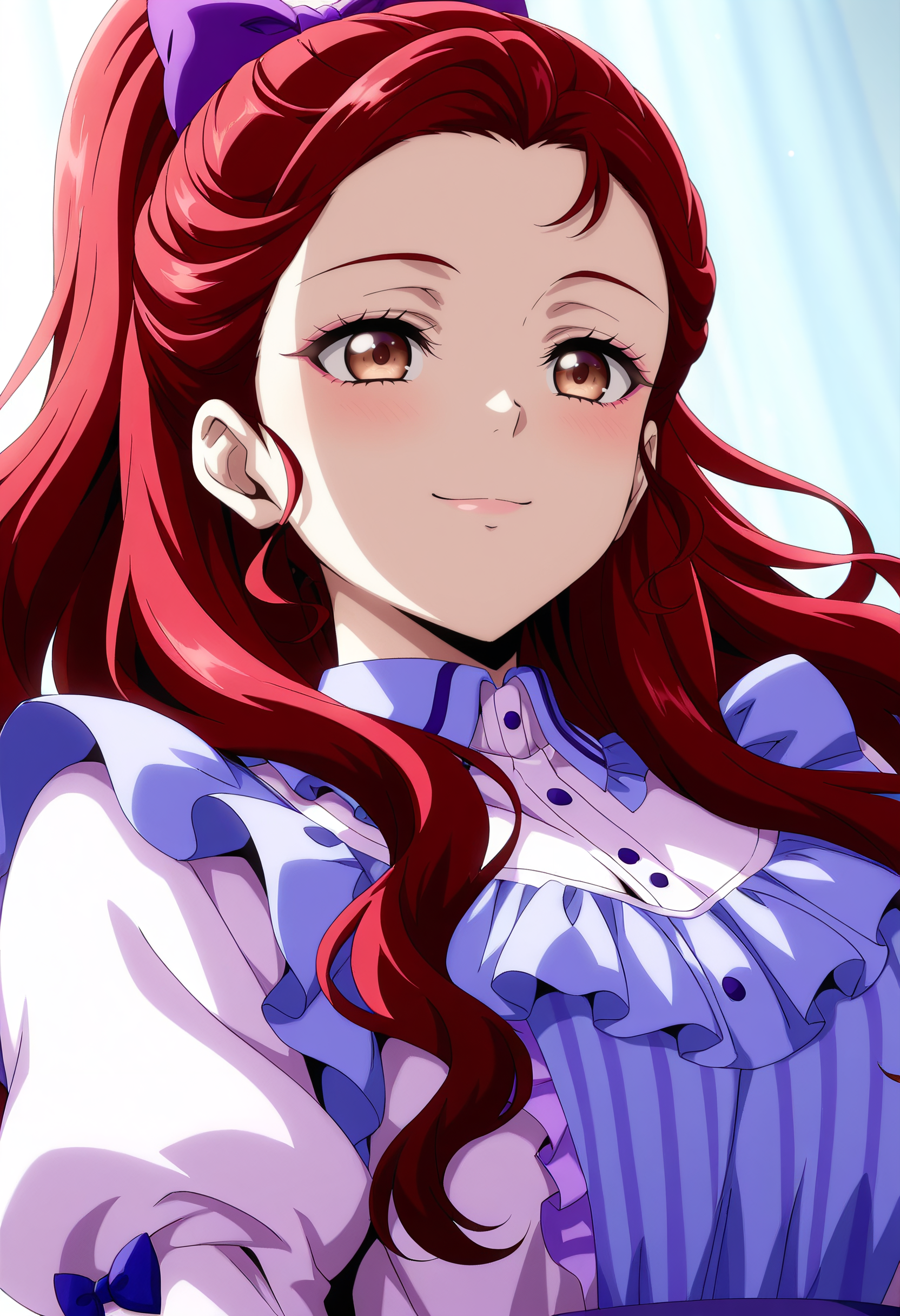 SelenaOutfit, 리본, 머리 리본, 머리 띠, 리본, 칼라 셔츠, 보라색 드레스, 보라색 리본, 줄리엣 소매, 풍선 소매, 긴 소매, 드레스, 프릴, 프릴 소매,