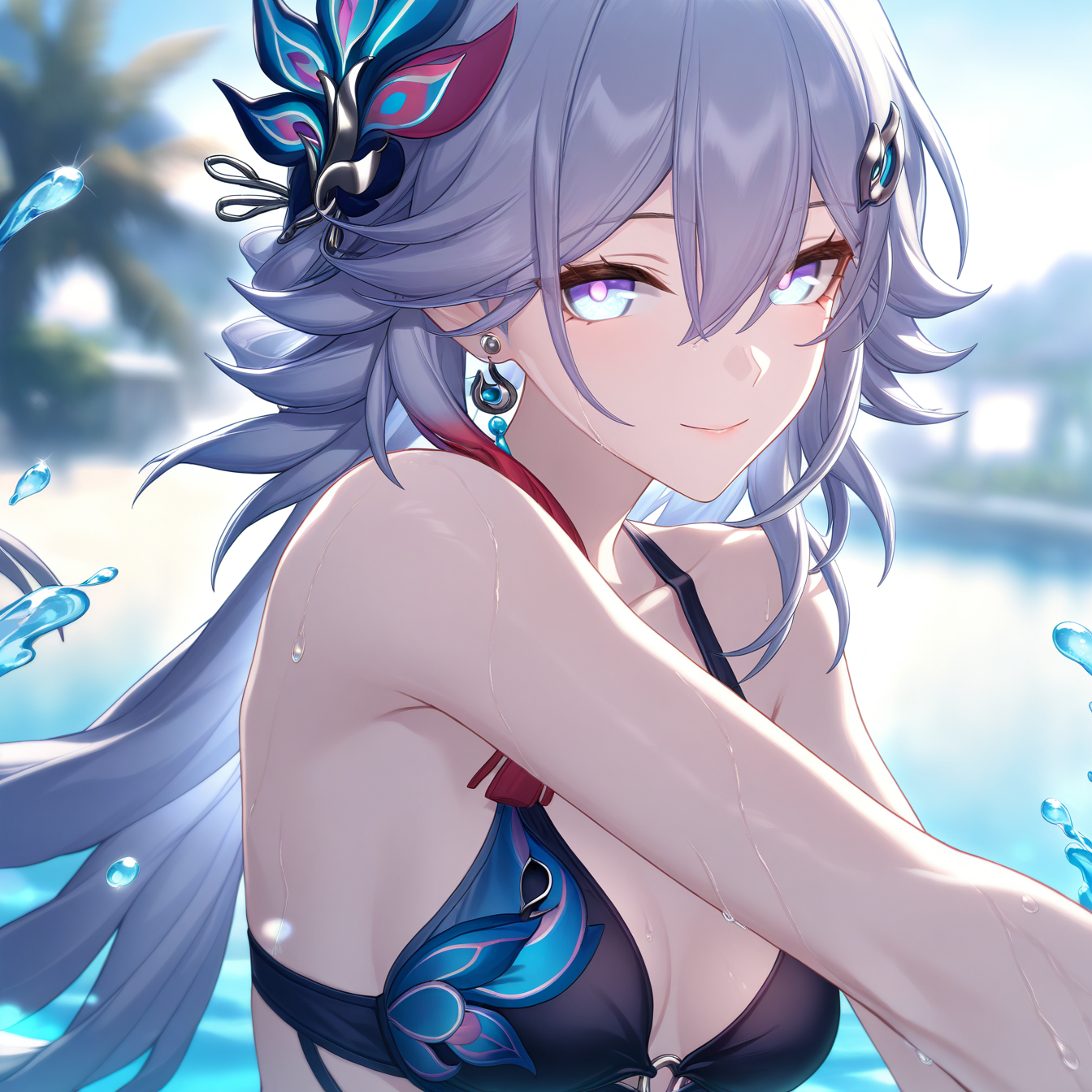 (masterpiece, best quality, very aesthetic, newest, hires), Yaoguang, 1girl, solo, medium breasts, hair ornament, bracelet, dress, bare shoulders, looking at viewer, smile, confident, sideboob, cowboy shot, romantic, love, detailed light, epic, dramatic, mibir,