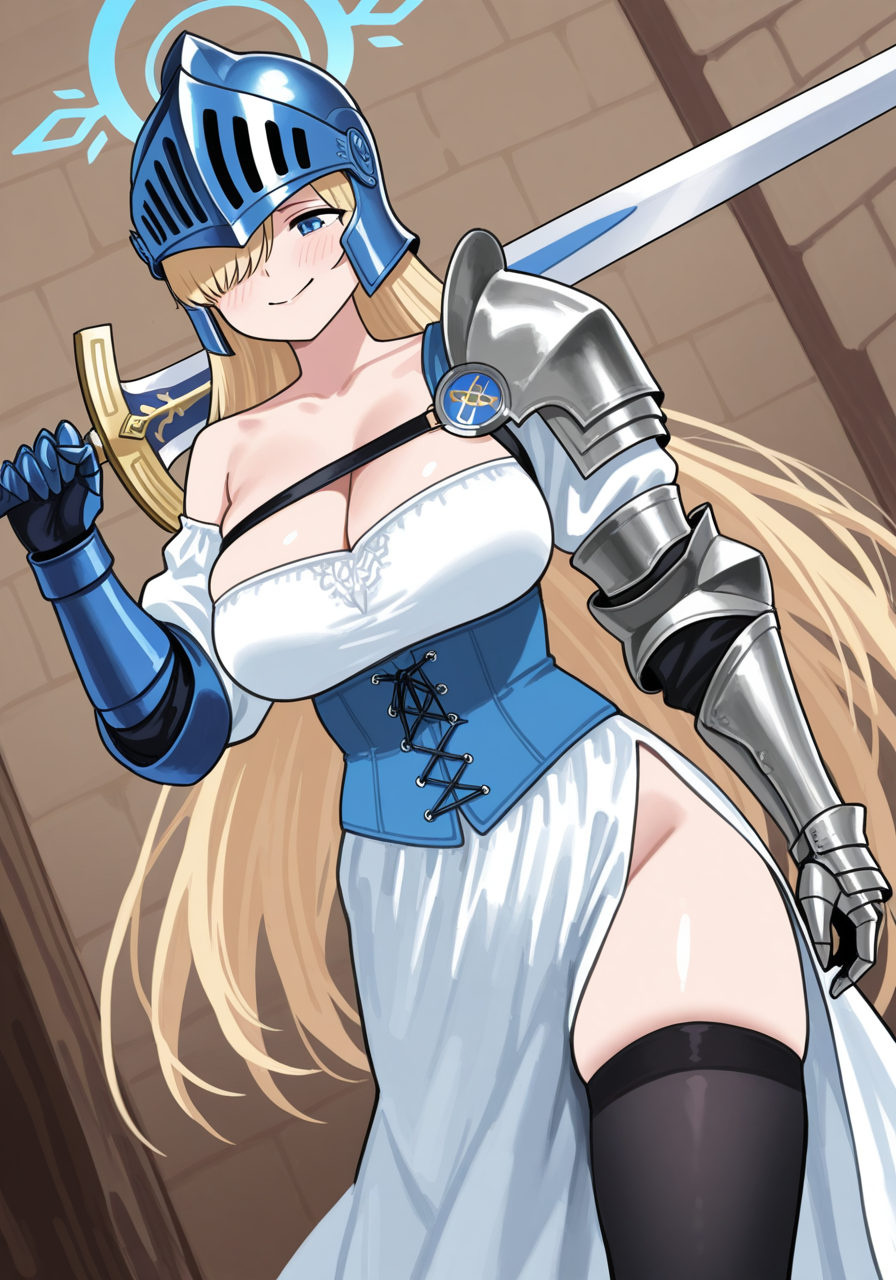 プロンプト例: 1girl, solo, virgin ribbed sweater, destroyer sweater, dark violet green sweater, navel, thighhighs, smile, looking at viewer, library, thick thighs, wide hips, large breasts, curvy, BREAK character_concept, cowboy_shot, (dutch_angle:1.25), masterpiece, best quality, amazing quality, very aesthetic, absurdres, modern, recent, newest, lora:Mugi\_IL\_Style\_epoch\_4:1 Mu6i
