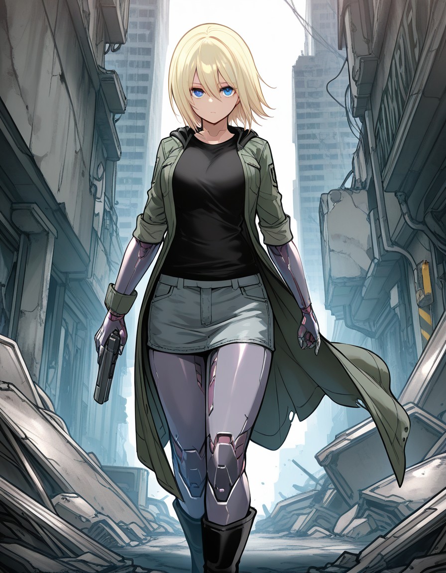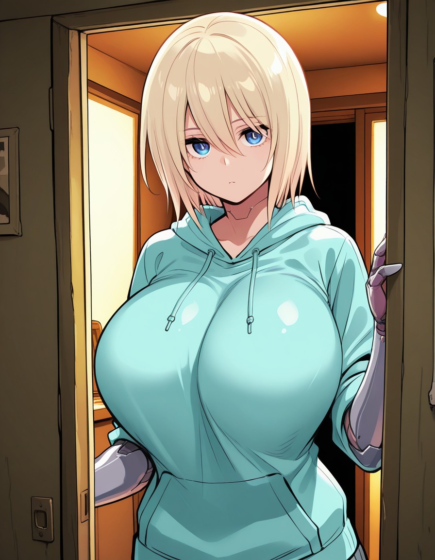 - キャラクター:アンドロイド女性、青い目、ロボットの腕、金髪、目の間の髪、短い髪、ロボットの関節、ロボットの脚