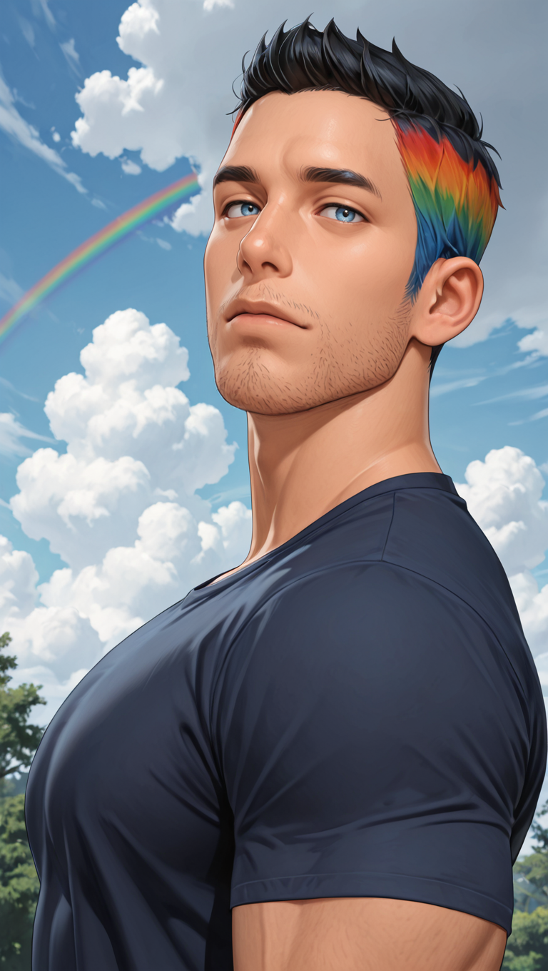 ts4jackson, 1boy, stubble, very short hair, multicolored hair, rainbow hair, black hair, blue eyes, mature