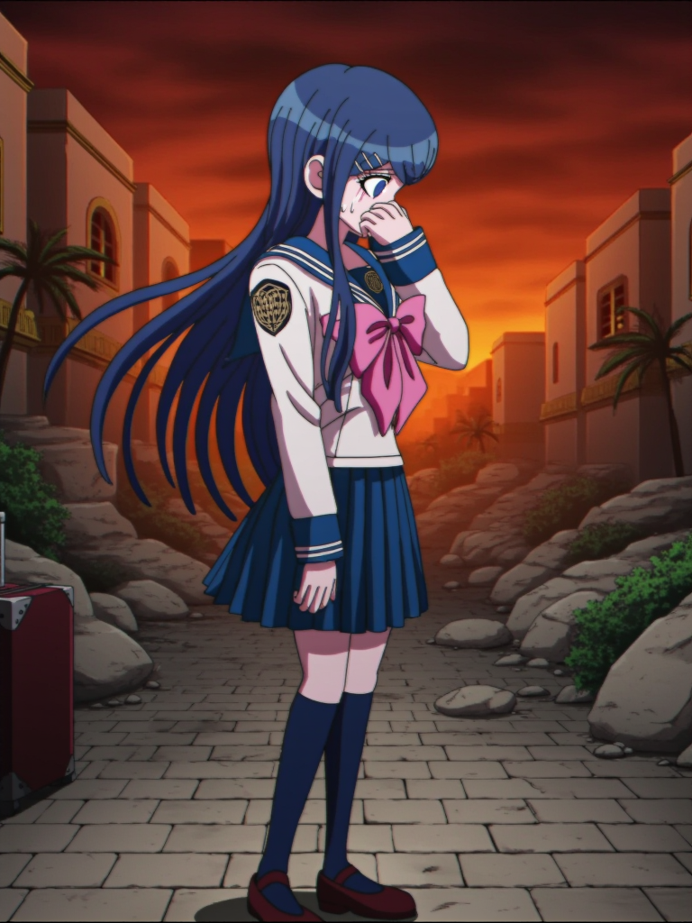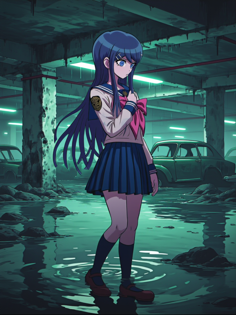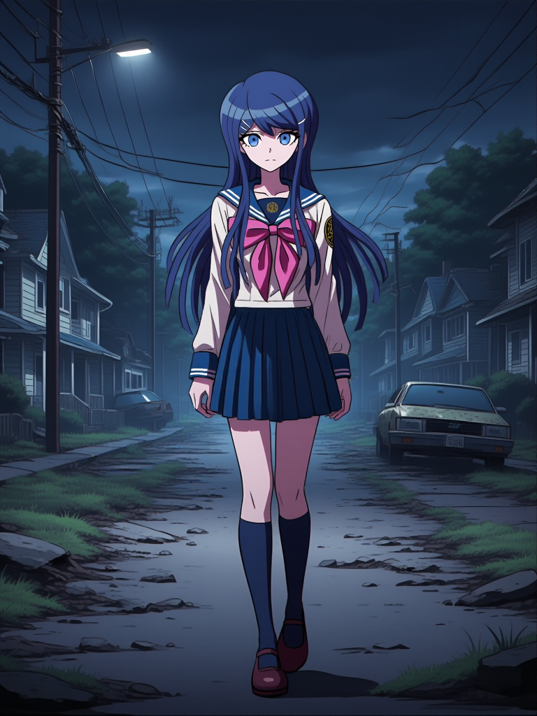 苗木诚穿着标准《弹丸论破》校服(叙事): danganronpa_(series), maizono_sayaka, 一幅苗木诚的图像。她留着长长的蓝色头发。苗木诚穿着《弹丸论破1》的校服。这套校服为白色水手服样式,配有独特的深蓝色衣领,边缘饰有清晰的白色条纹。她佩戴的深蓝色衣领向下延伸至胸前,系着一个醒目的大粉红色蝴蝶结。衣领上、蝴蝶结正上方可见一个圆形深色徽章,暗示她隶属于希望之峰学园。她的长袖为纯白色,袖口饰有两条精确的深蓝色条纹。肩部有一枚金色徽章。袖子长度至手腕。她穿着一条短款百褶蓝色短裙。脚穿深蓝色及膝长袜。鞋子为深棕色玛丽珍鞋。
